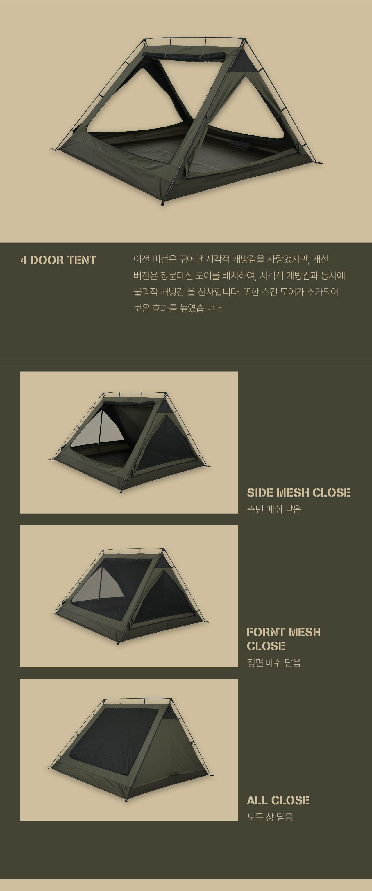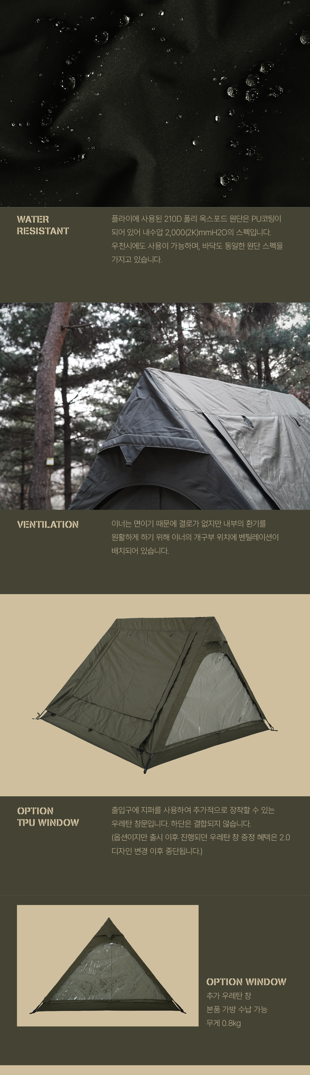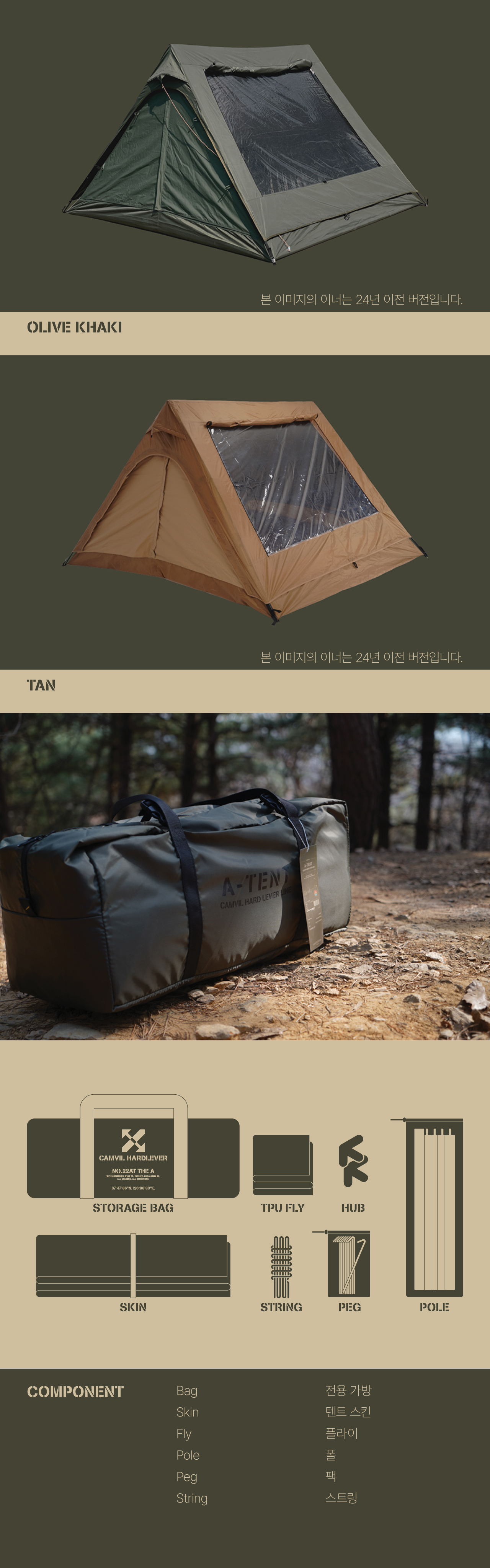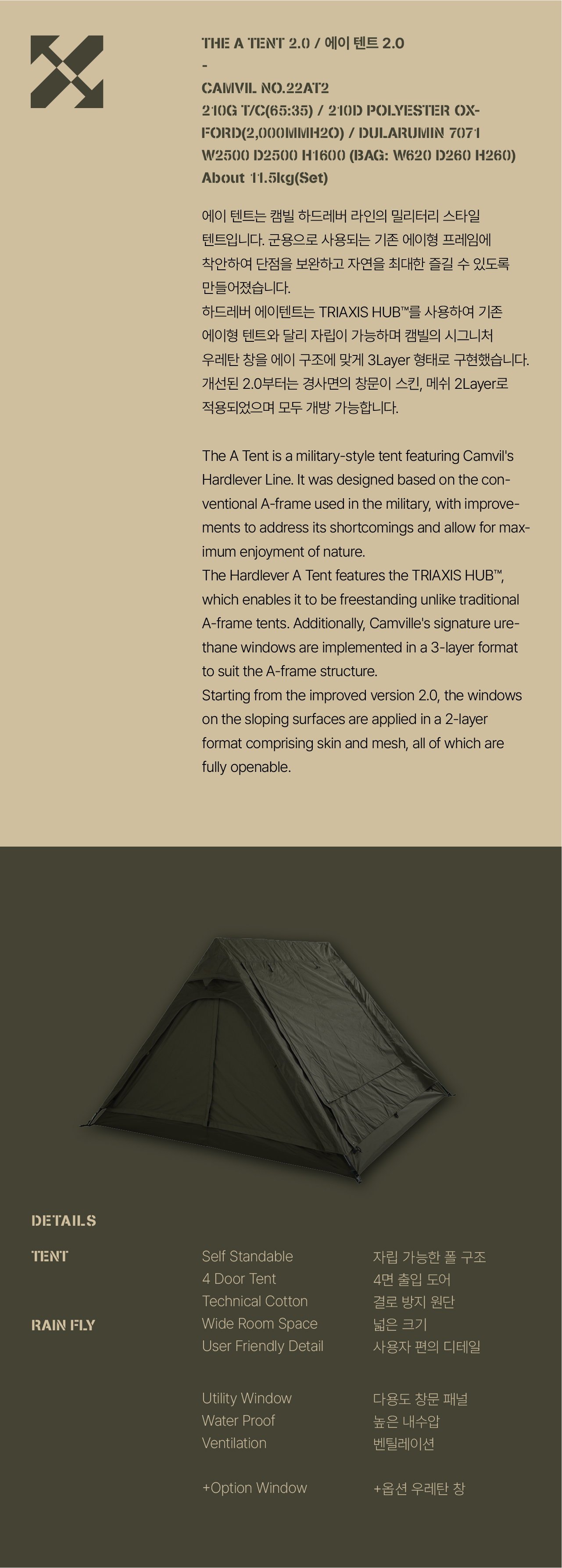 에이 텐트는 캠빌 하드레버 라인의 밀리터리 스타일 텐트입니다. 군용으로 사용되는 기존 에이형 프레임에 착안하여 단점을 보완하고 자연을 최대한 즐길 수 있도록 만들어졌습니다. 하드레버 에이텐트는 TRIAXIS HUB™를 사용하여 기존 에이형 텐트와 달리 자립이 가능하며 캠빌의 시그니처 우레탄 창을 에이 구조에 맞게 3Layer 형태로 구현했습니다. 개선된 2.0부터는 경사면의 창문이 스킨, 메쉬 2Layer로 적용되었으며 모두 개방 가능합니다.