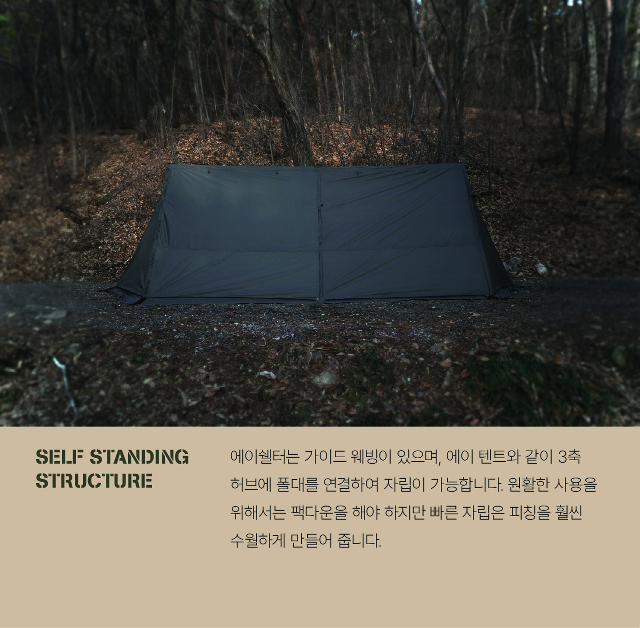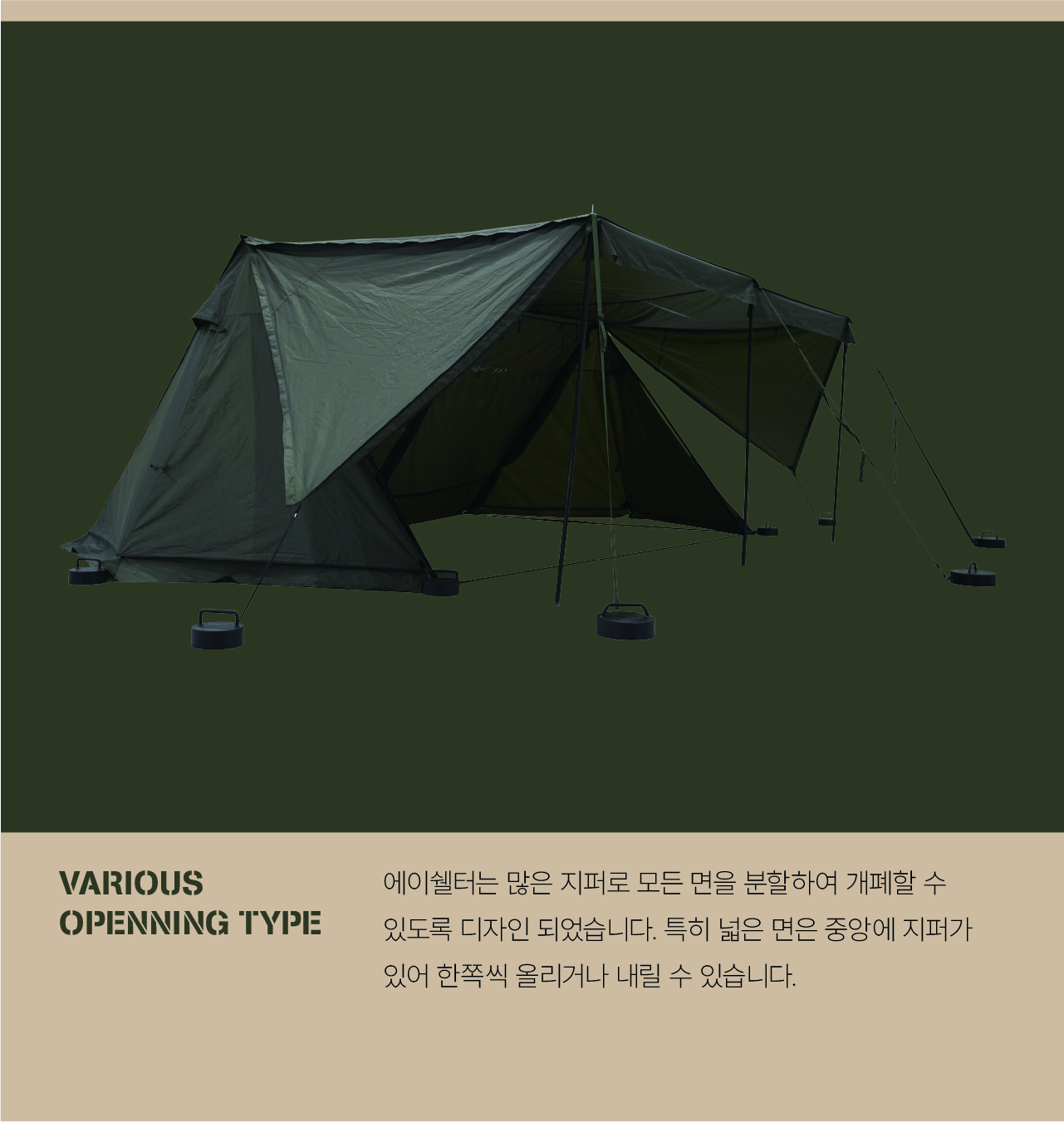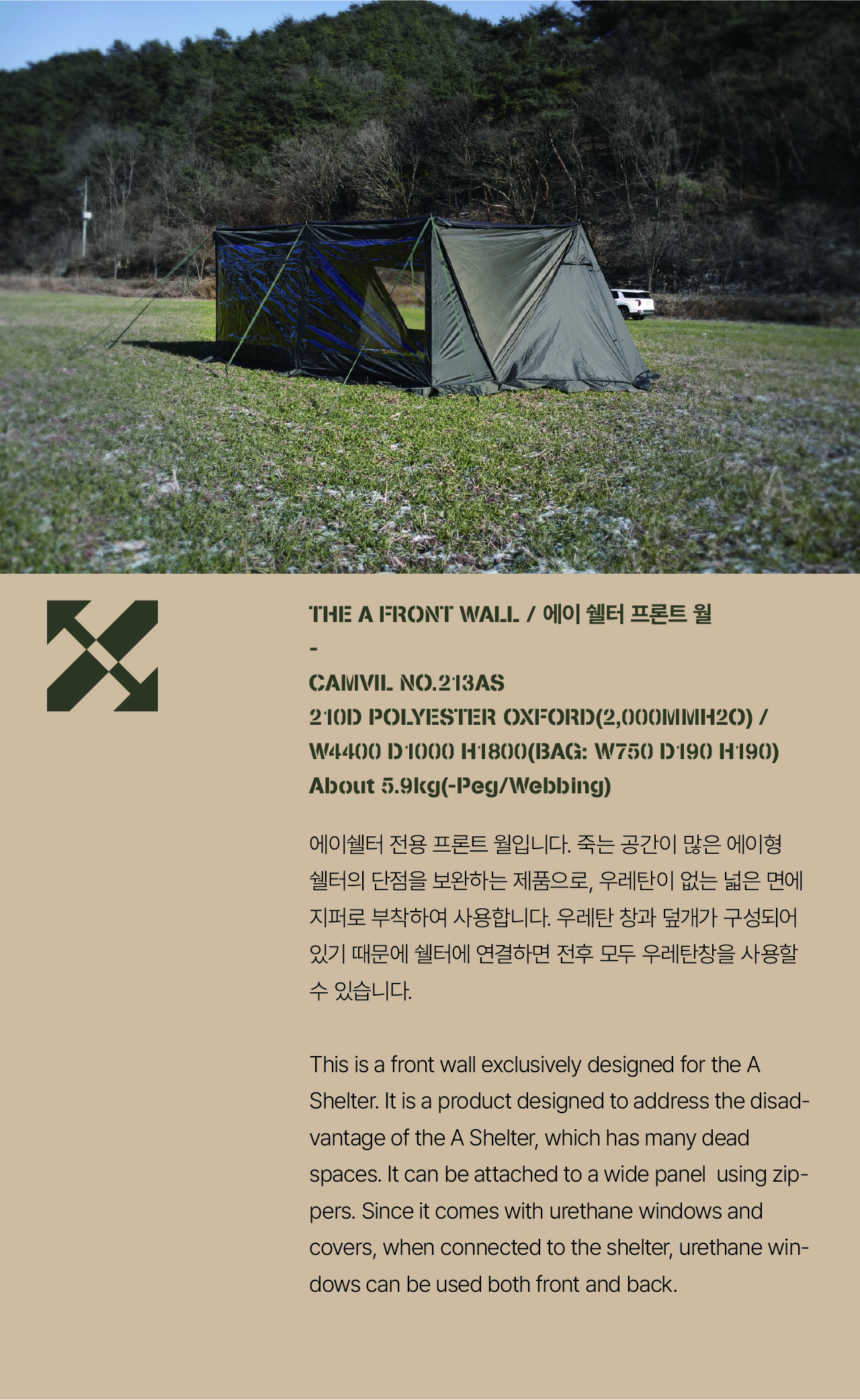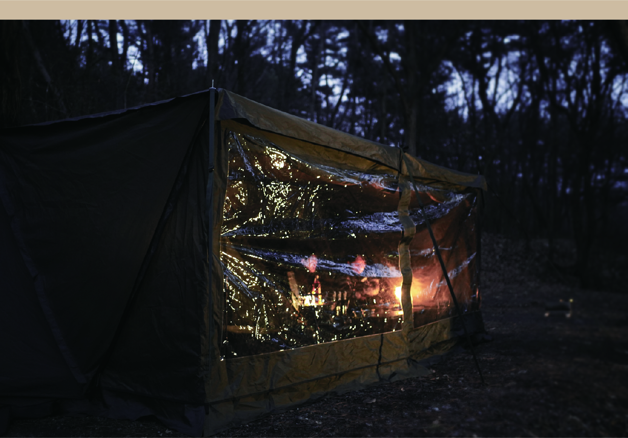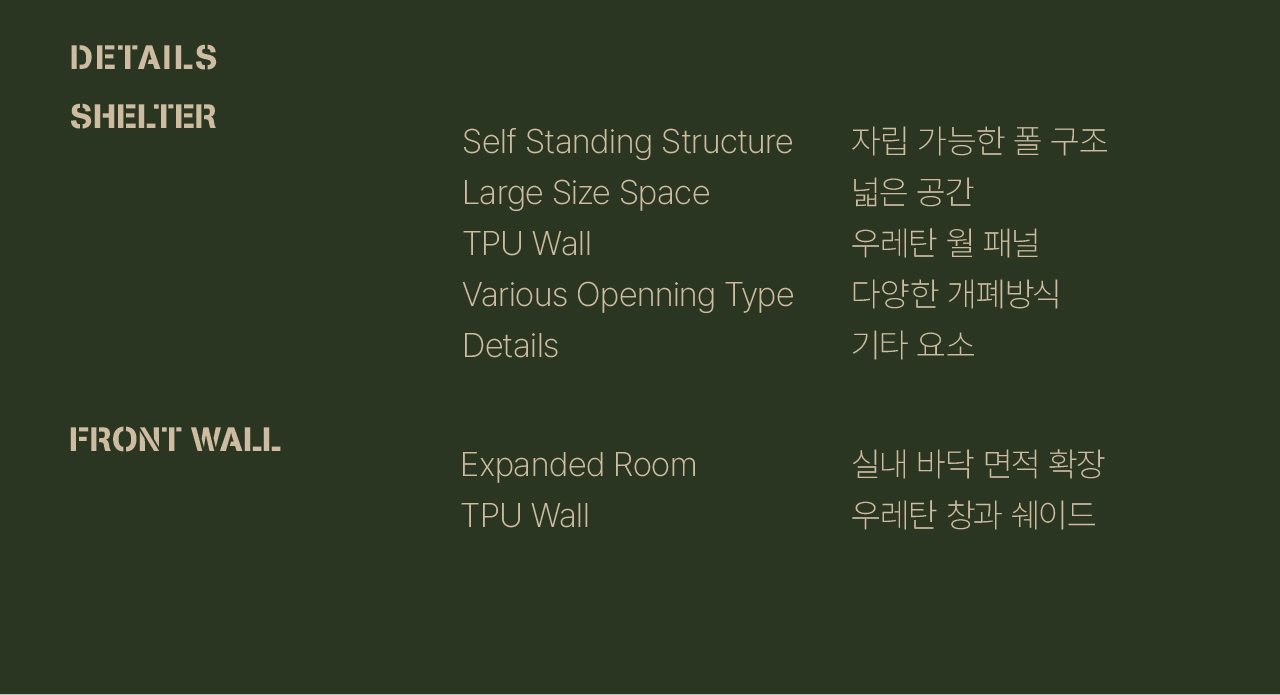 에이 쉘터는 밀리터리 컨셉을 기반으로 현대적인 구조를 접목하여 디자인된 쉘터입니다. 수직폴을 ㅅ자 폴대로 대체해 활동성을 높이고 설치가 용이하도록 만들었으며, 한쪽 면에는 우레탄 창을 배치하여 자연을 즐길 수 있도록 했습니다. 넓은 면은 지퍼로 나누어 열 수 있기 때문에 상황에 따라 다양한 연출이 가능합니다. 또한 전용 프론트 월을 장착하면 더욱 넓은 공간활용이 가능합니다