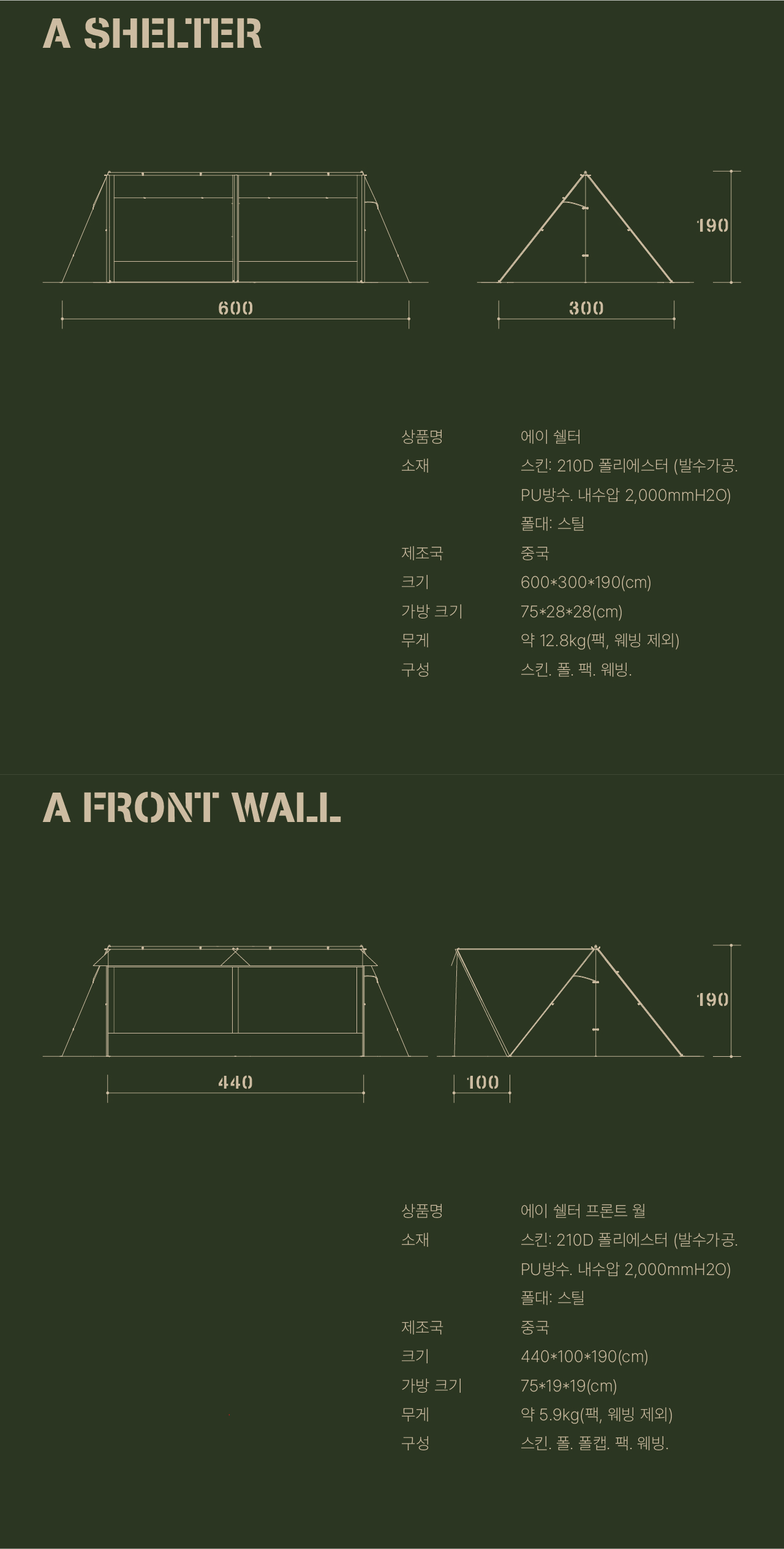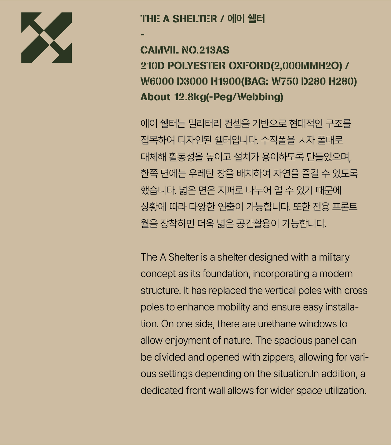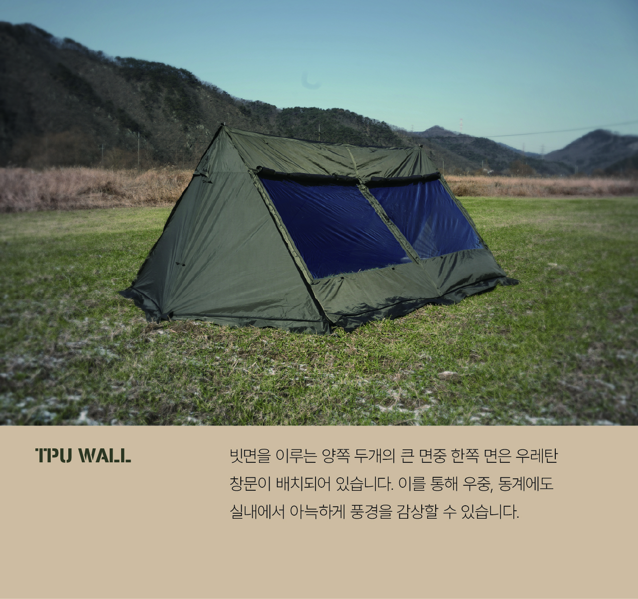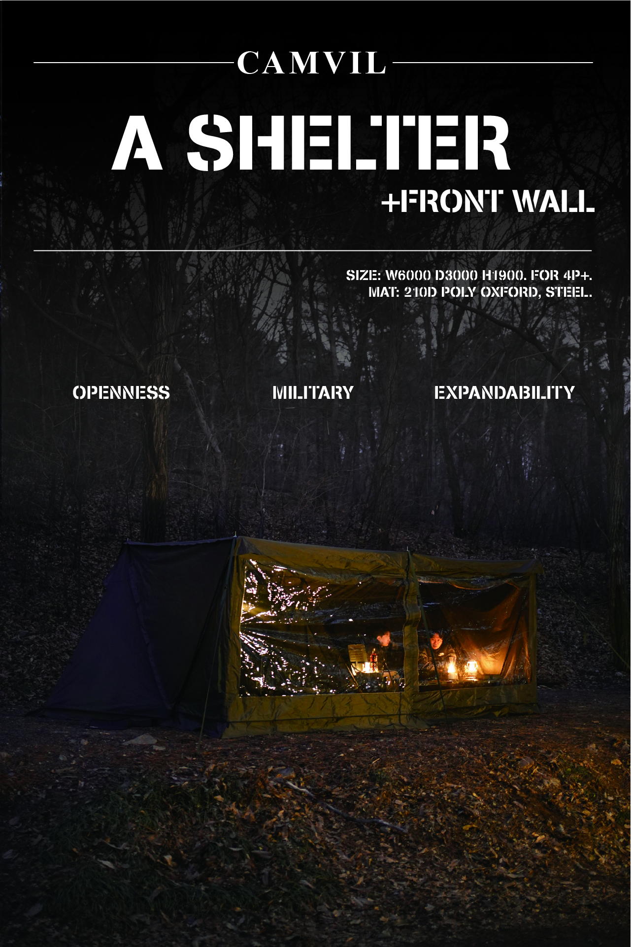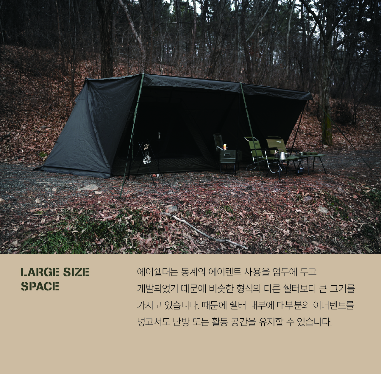 에이 쉘터는 밀리터리 컨셉을 기반으로 현대적인 구조를 접목하여 디자인된 쉘터입니다. 수직폴을 ㅅ자 폴대로 대체해 활동성을 높이고 설치가 용이하도록 만들었으며, 한쪽 면에는 우레탄 창을 배치하여 자연을 즐길 수 있도록 했습니다. 넓은 면은 지퍼로 나누어 열 수 있기 때문에 상황에 따라 다양한 연출이 가능합니다. 또한 전용 프론트 월을 장착하면 더욱 넓은 공간활용이 가능합니다