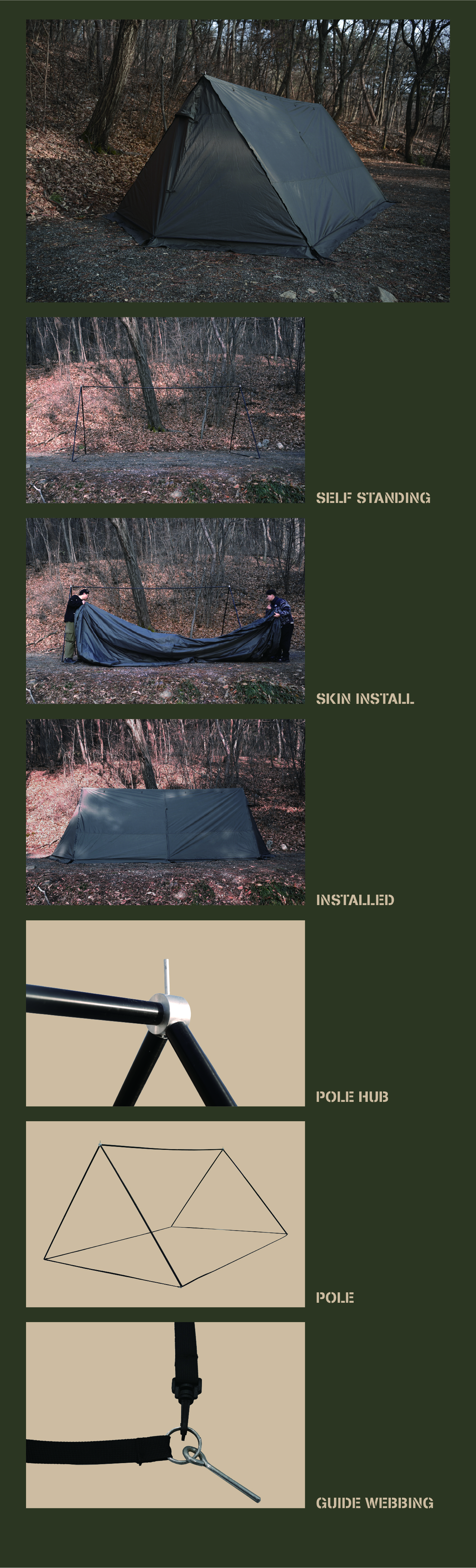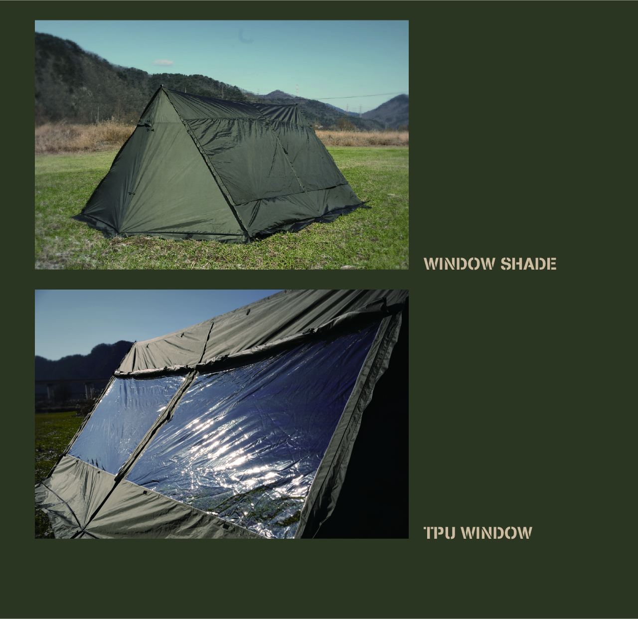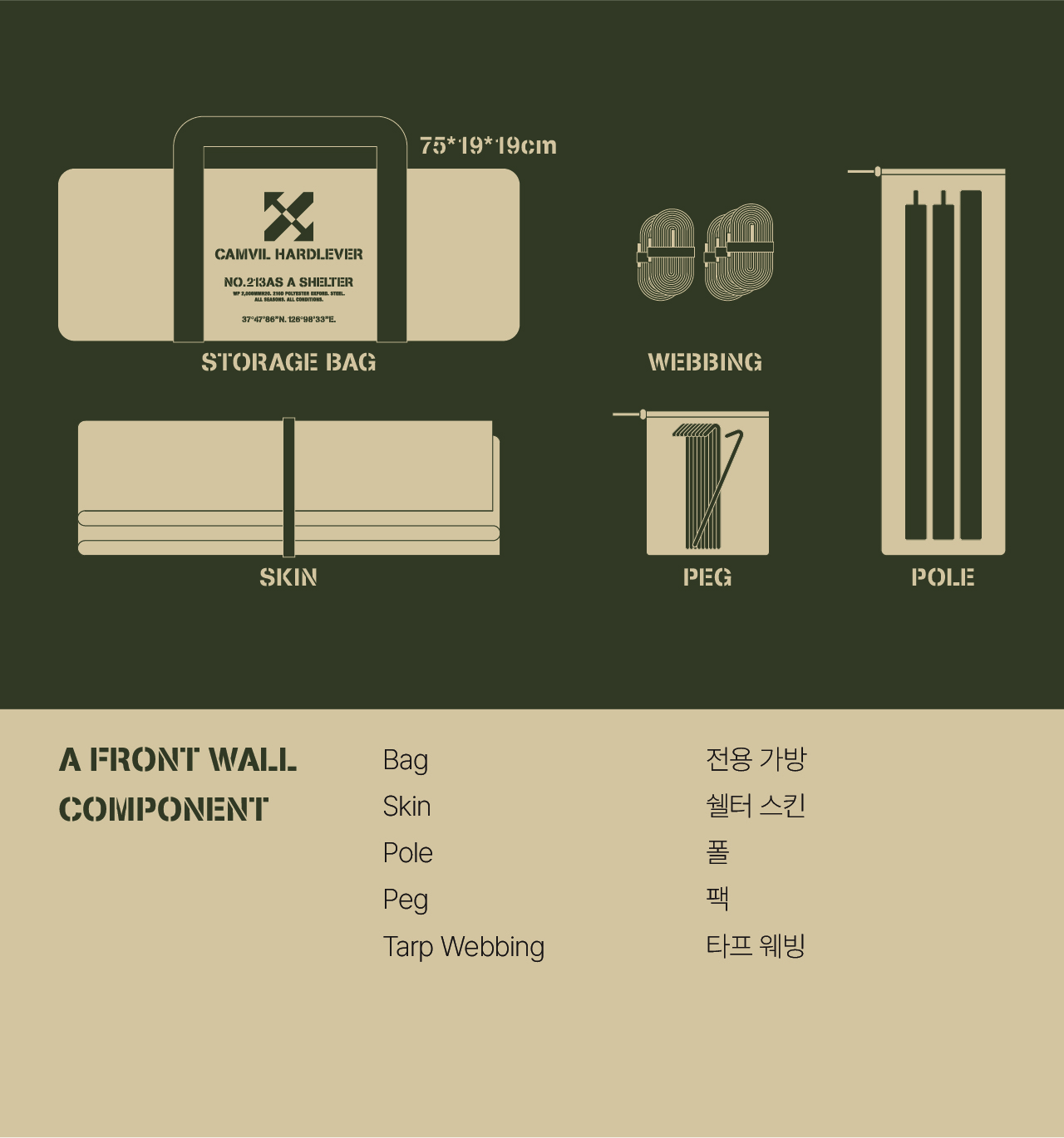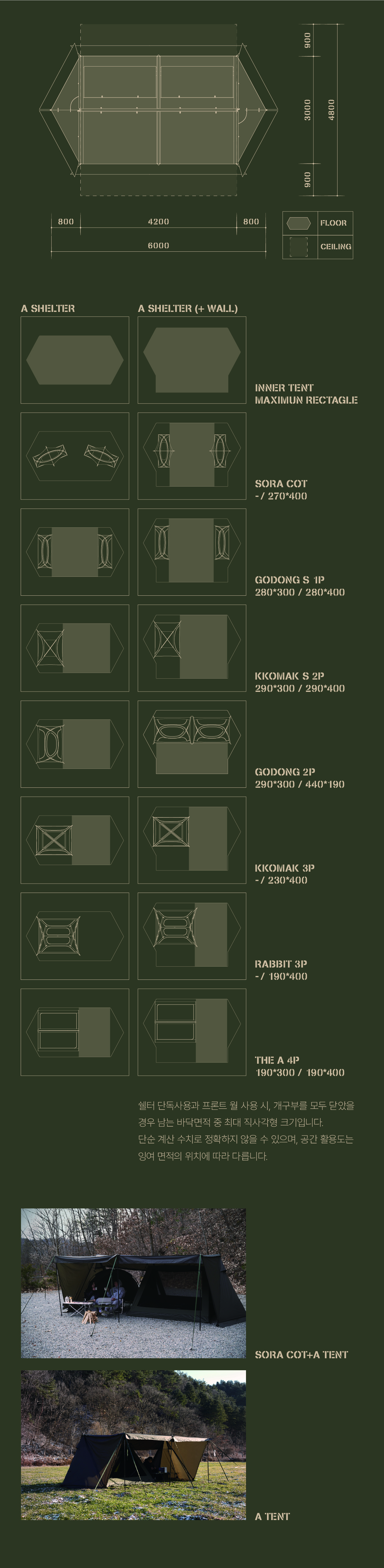 에이 쉘터는 밀리터리 컨셉을 기반으로 현대적인 구조를 접목하여 디자인된 쉘터입니다. 수직폴을 ㅅ자 폴대로 대체해 활동성을 높이고 설치가 용이하도록 만들었으며, 한쪽 면에는 우레탄 창을 배치하여 자연을 즐길 수 있도록 했습니다. 넓은 면은 지퍼로 나누어 열 수 있기 때문에 상황에 따라 다양한 연출이 가능합니다. 또한 전용 프론트 월을 장착하면 더욱 넓은 공간활용이 가능합니다