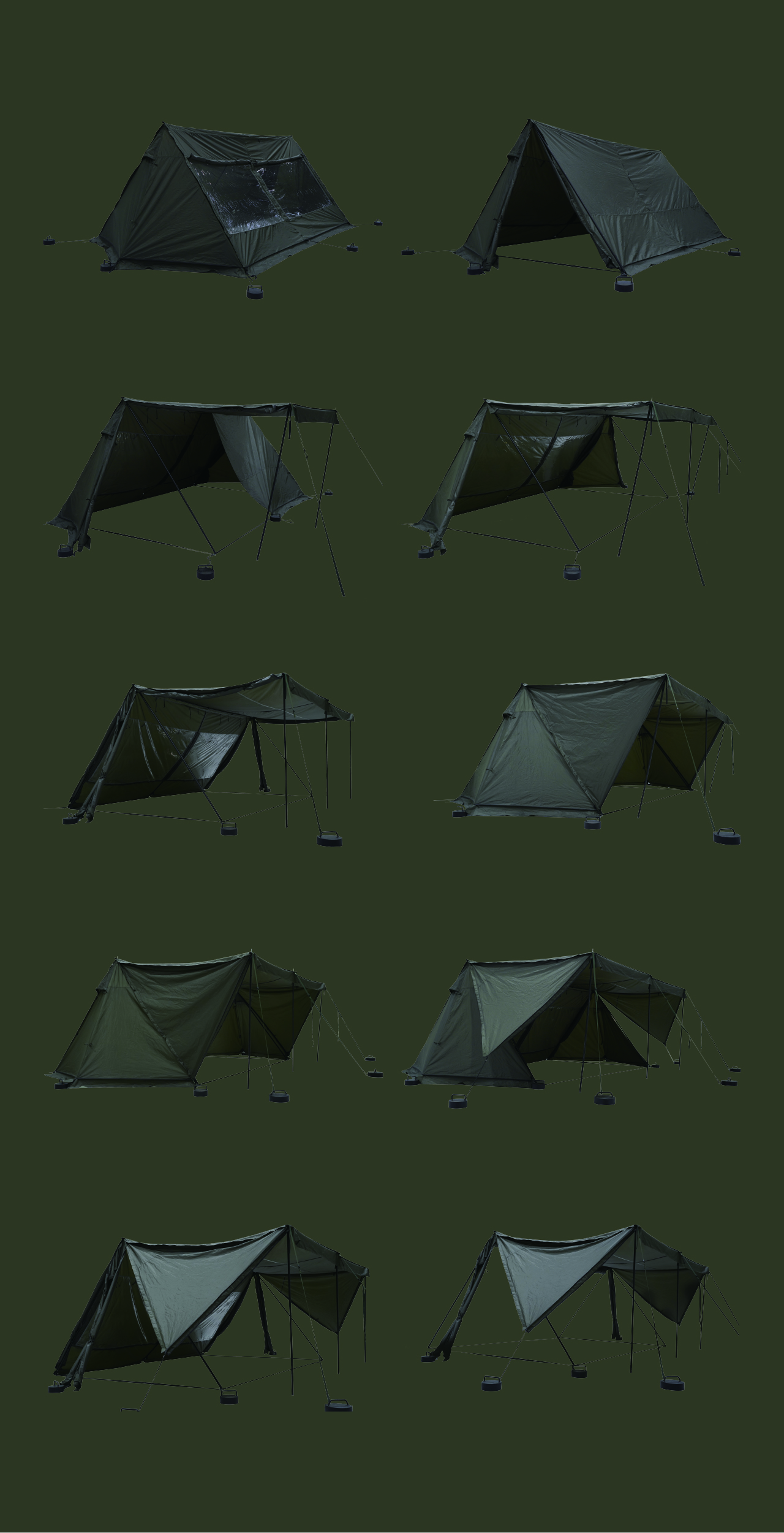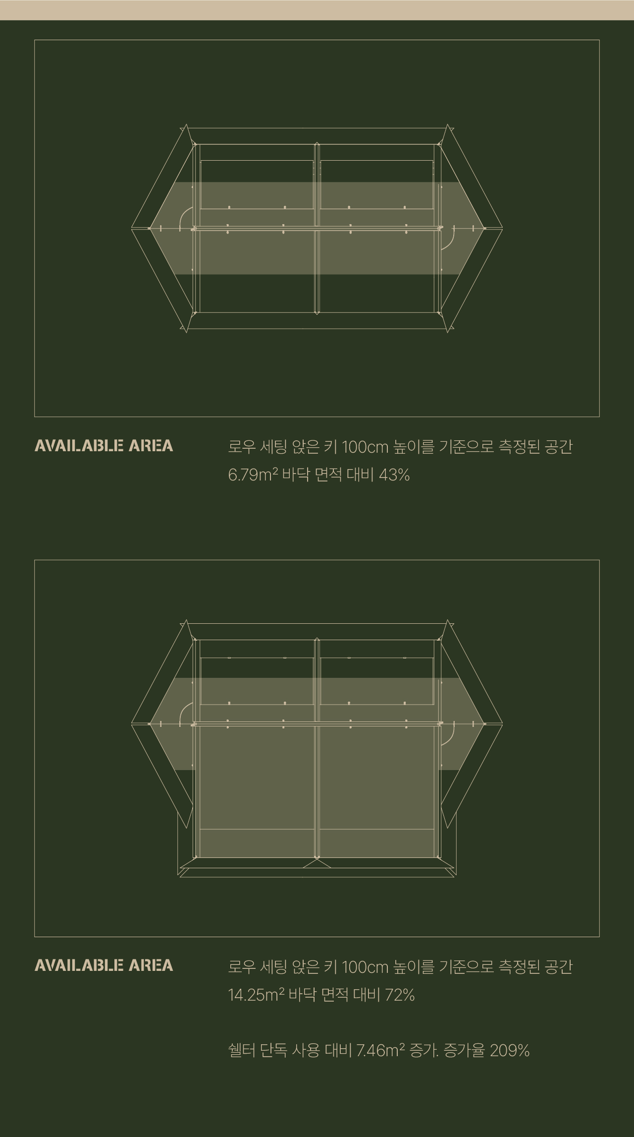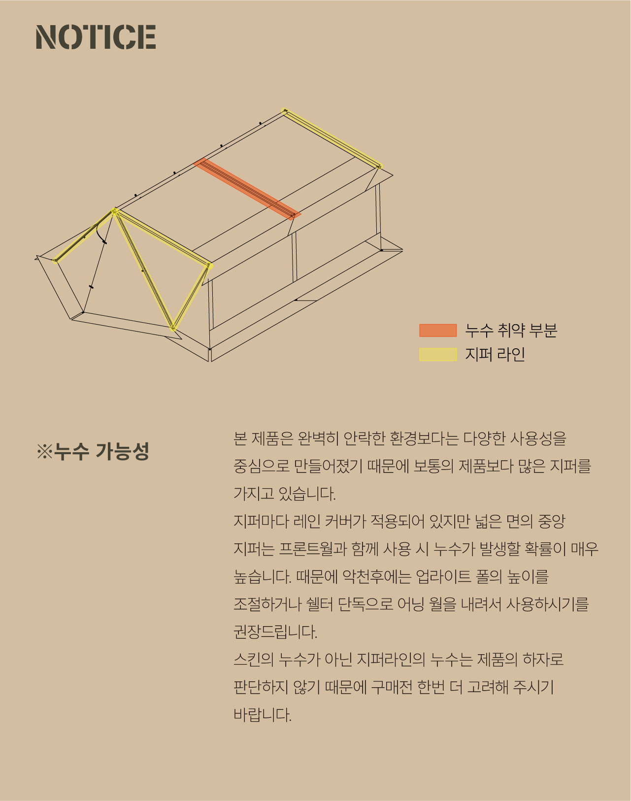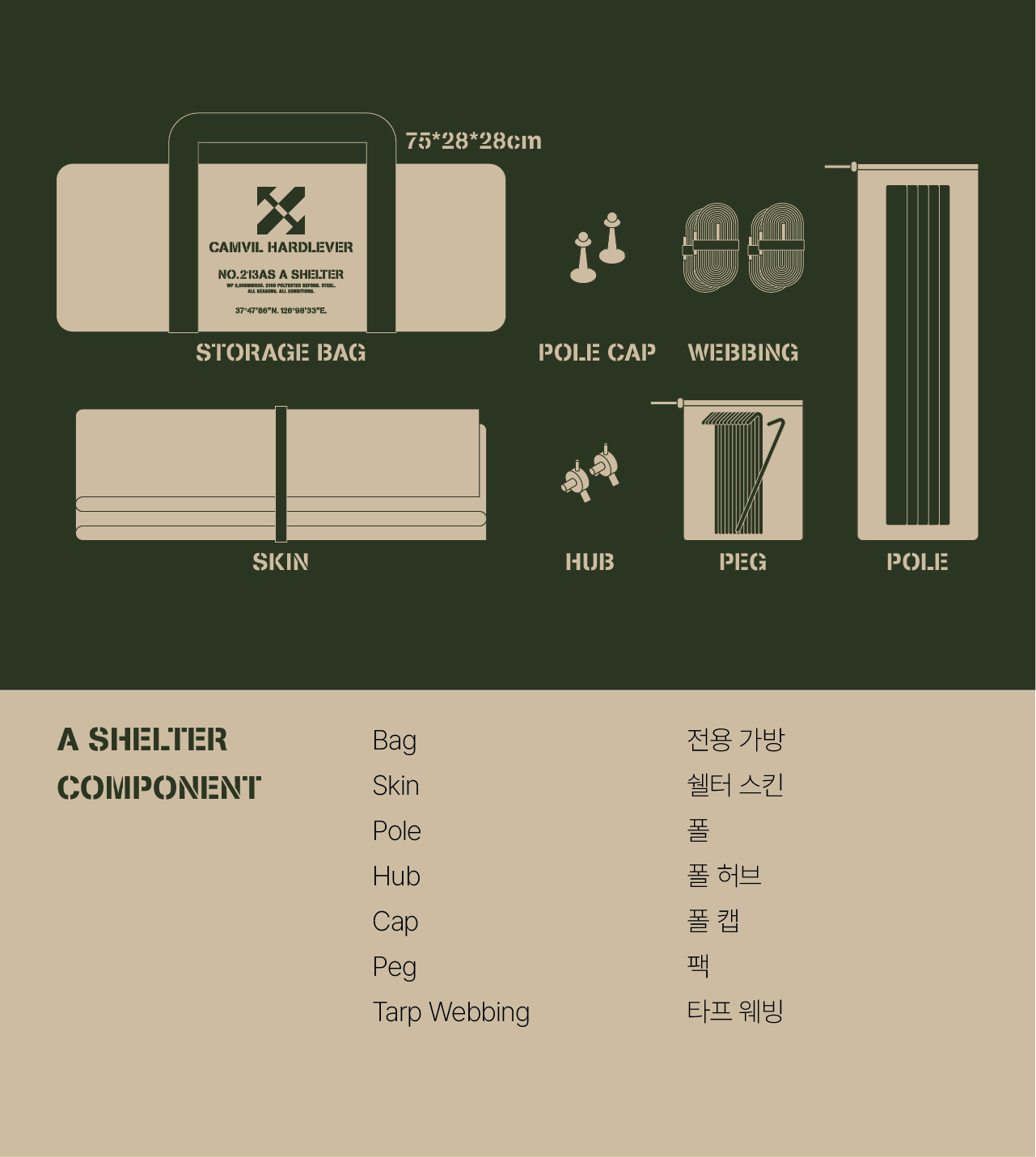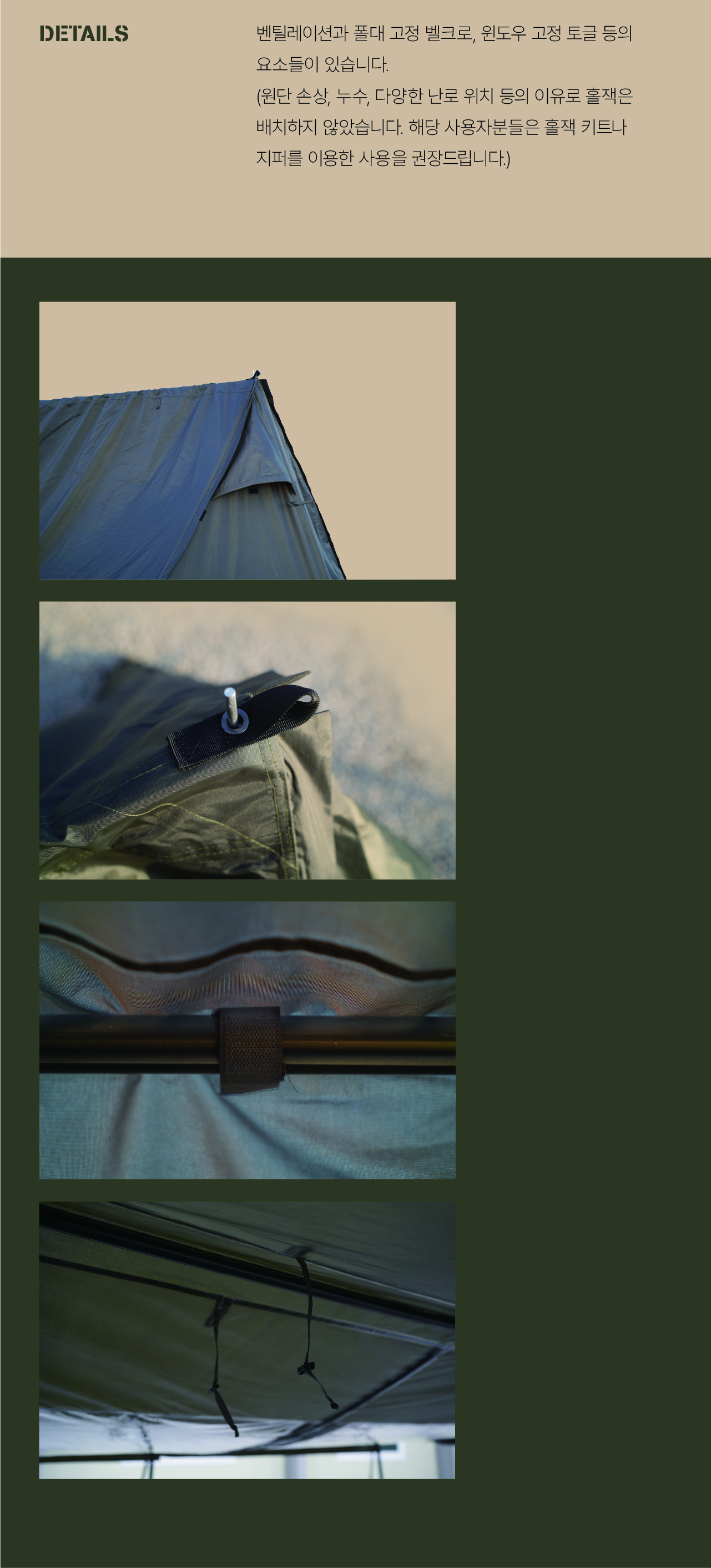 에이 쉘터는 밀리터리 컨셉을 기반으로 현대적인 구조를 접목하여 디자인된 쉘터입니다. 수직폴을 ㅅ자 폴대로 대체해 활동성을 높이고 설치가 용이하도록 만들었으며, 한쪽 면에는 우레탄 창을 배치하여 자연을 즐길 수 있도록 했습니다. 넓은 면은 지퍼로 나누어 열 수 있기 때문에 상황에 따라 다양한 연출이 가능합니다. 또한 전용 프론트 월을 장착하면 더욱 넓은 공간활용이 가능합니다
