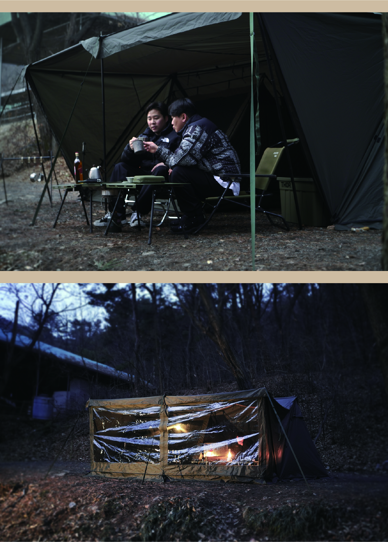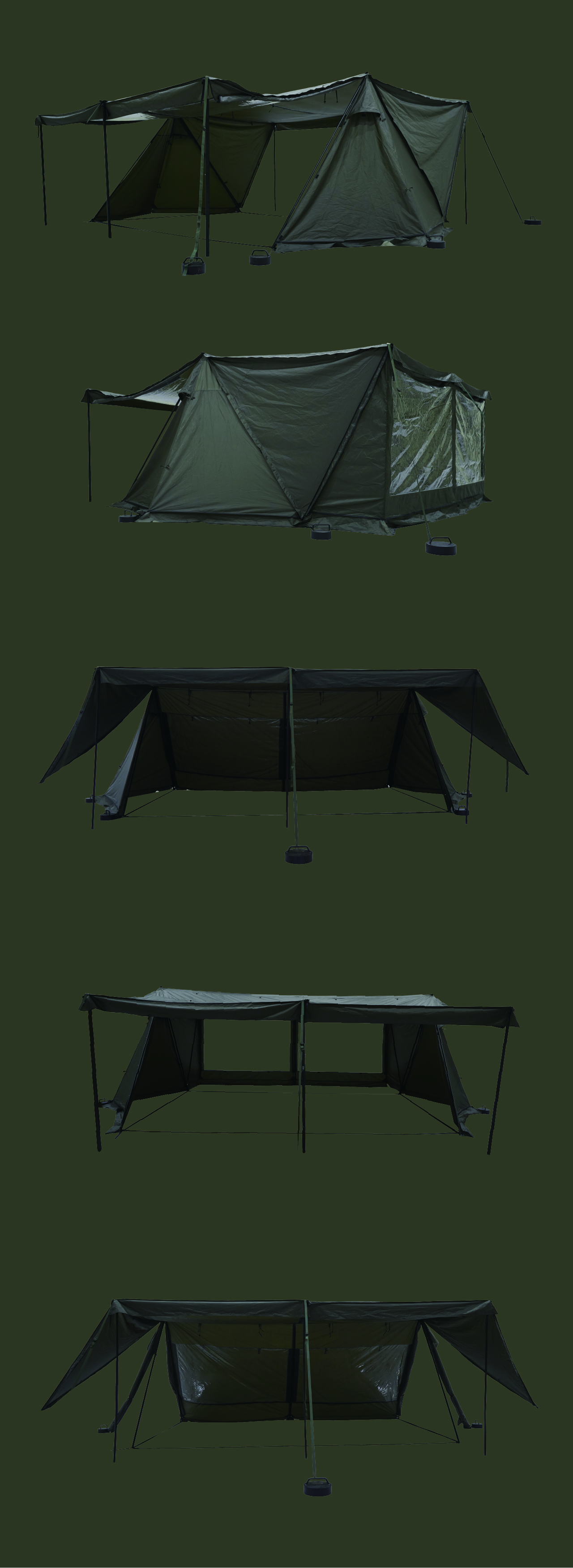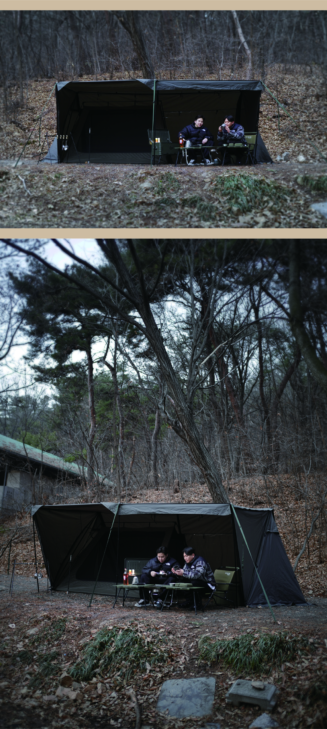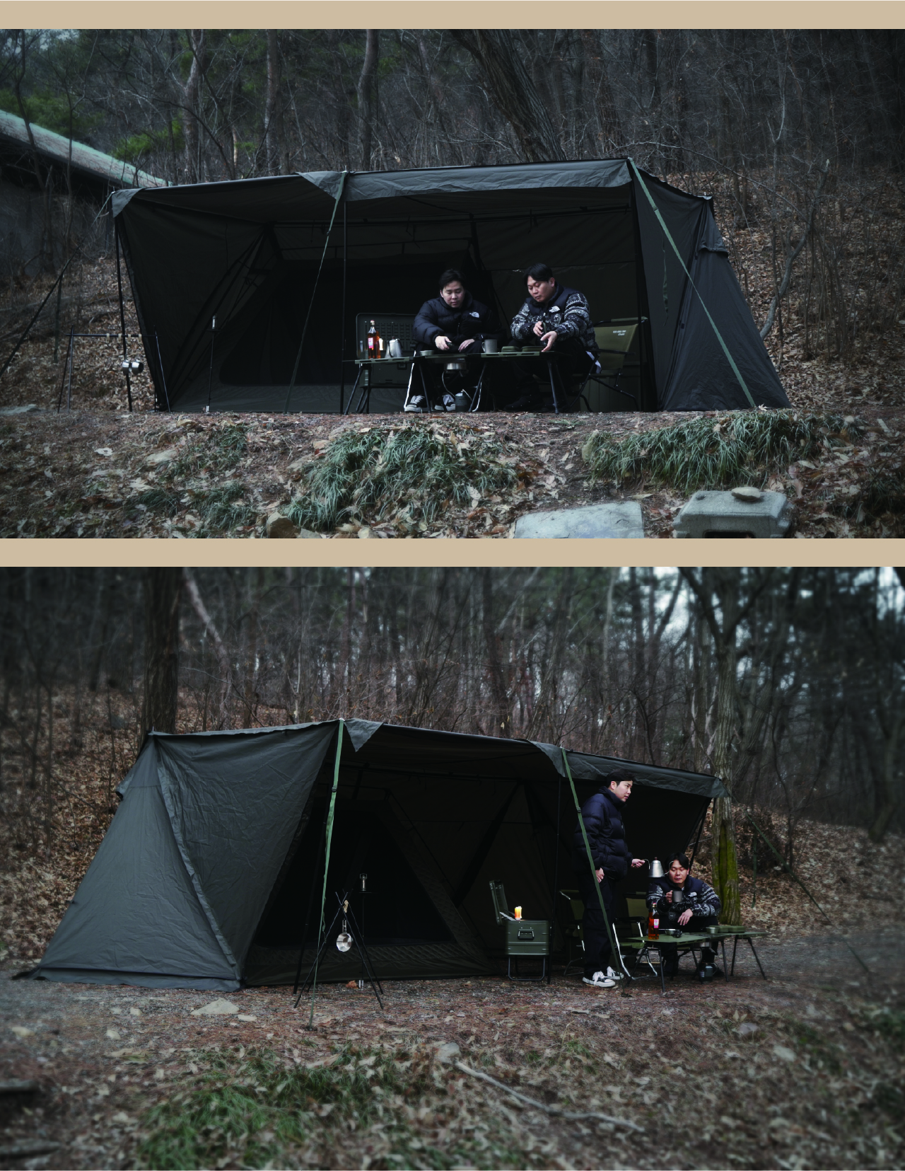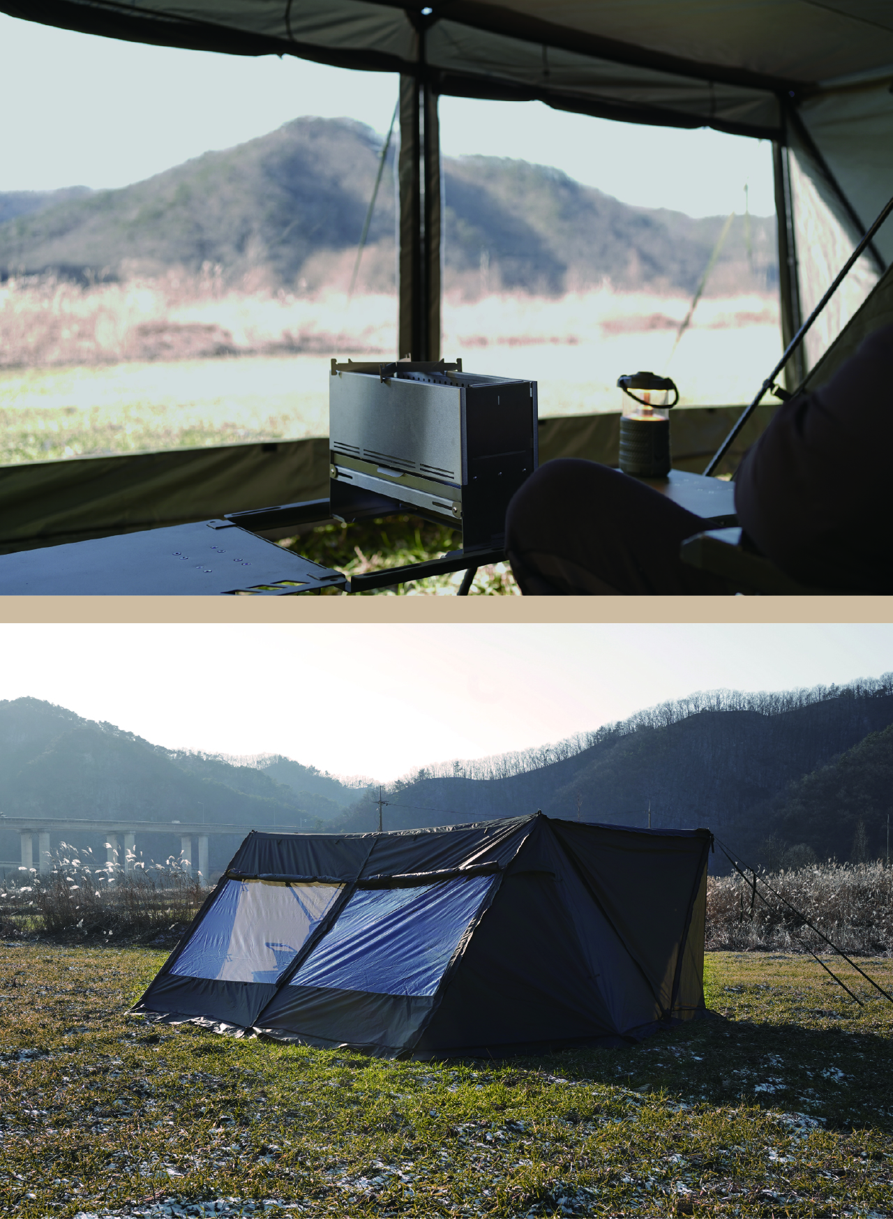 에이 쉘터는 밀리터리 컨셉을 기반으로 현대적인 구조를 접목하여 디자인된 쉘터입니다. 수직폴을 ㅅ자 폴대로 대체해 활동성을 높이고 설치가 용이하도록 만들었으며, 한쪽 면에는 우레탄 창을 배치하여 자연을 즐길 수 있도록 했습니다. 넓은 면은 지퍼로 나누어 열 수 있기 때문에 상황에 따라 다양한 연출이 가능합니다. 또한 전용 프론트 월을 장착하면 더욱 넓은 공간활용이 가능합니다.
