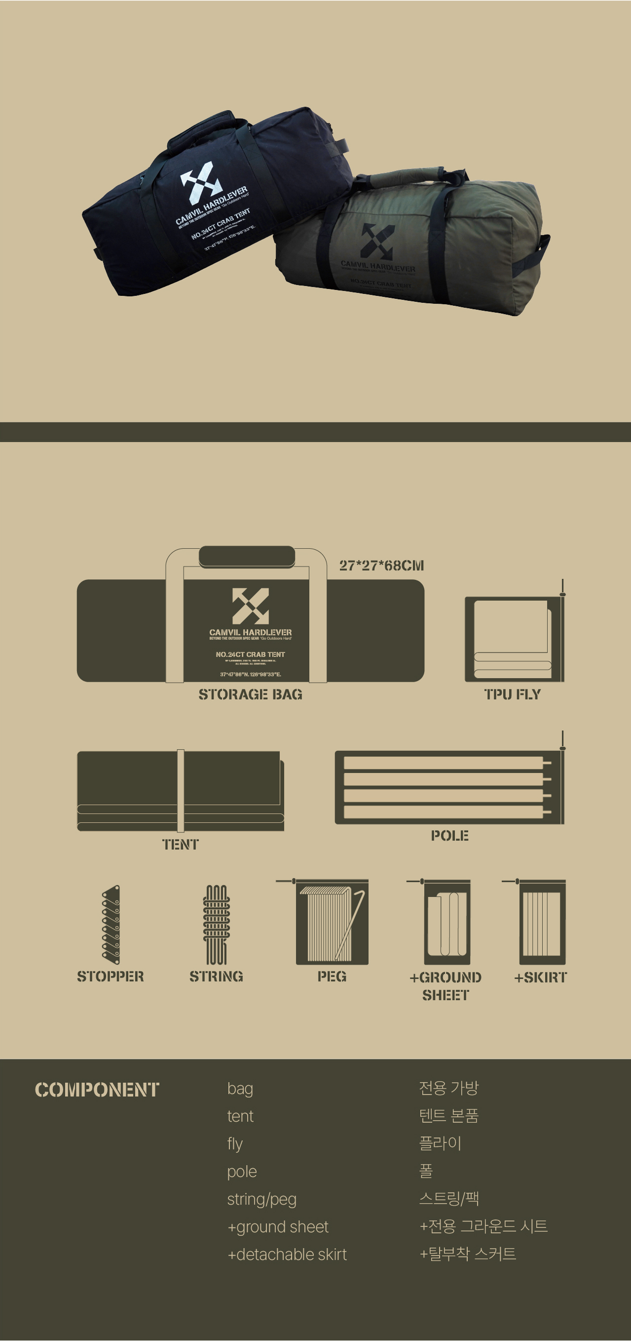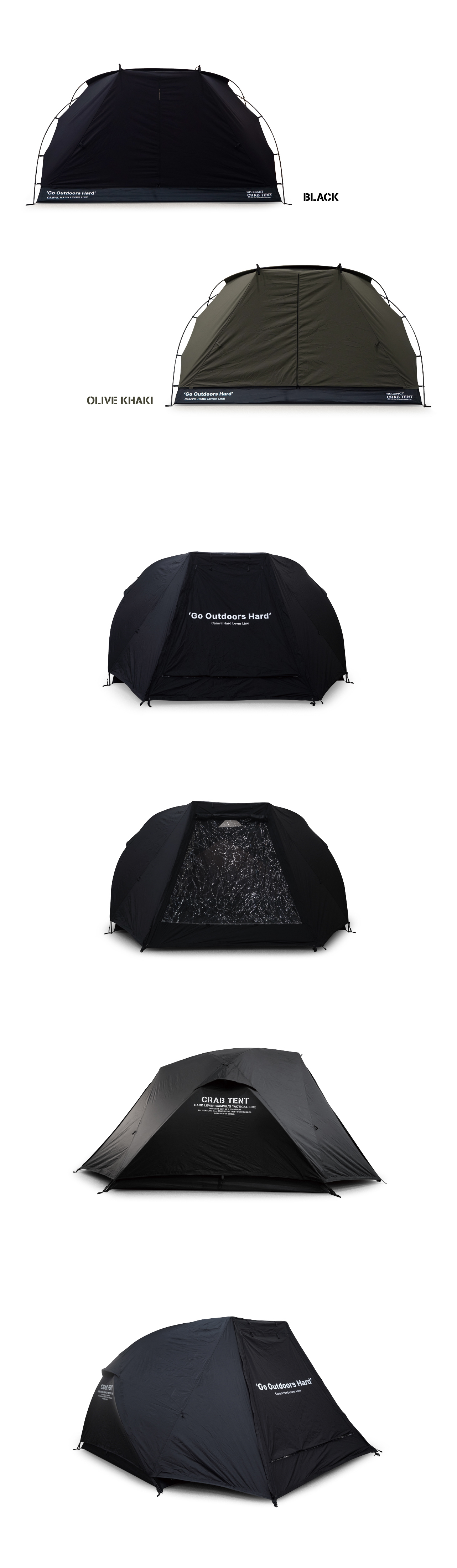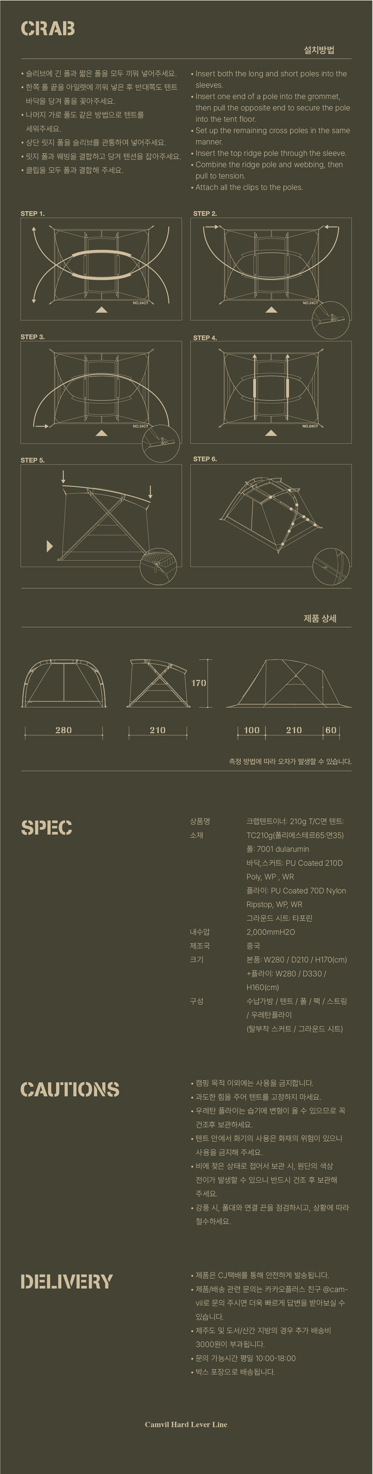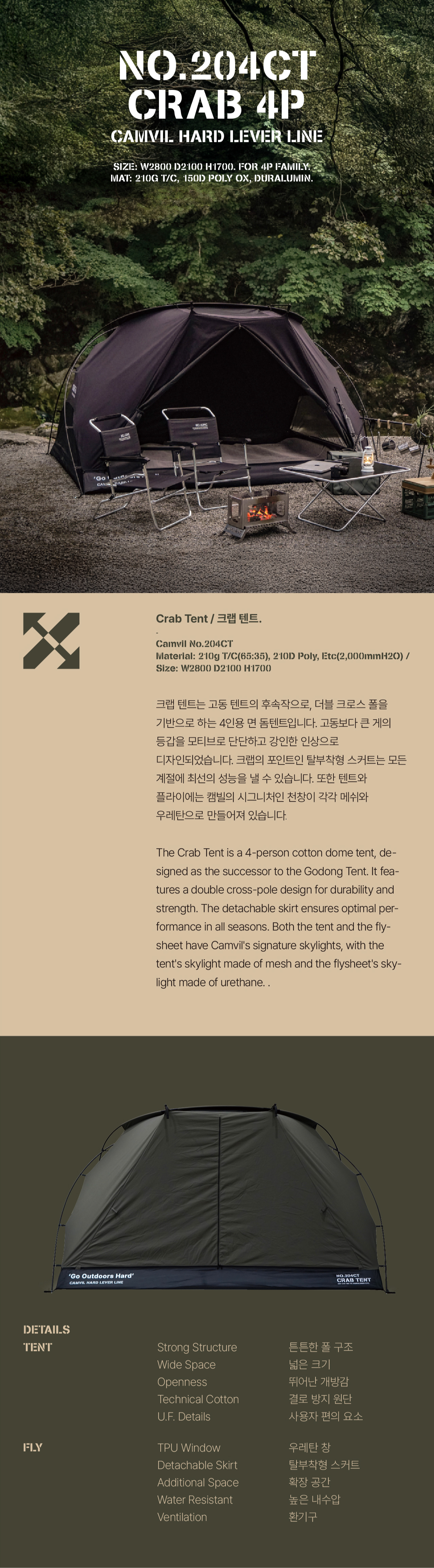 크랩 텐트는 고동 텐트의 후속작으로, 더블 크로스 폴을 기반으로 하는 4인용 면 돔텐트입니다. 고동보다 큰 게의 등갑을 모티브로 단단하고 강인한 인상으로 디자인되었습니다. 크랩의 포인트인 탈부착형 스커트는 모든 계절에 최선의 성능을 낼 수 있습니다. 또한 텐트와 플라이에는 캠빌의 시그니처인 천창이 각각 메쉬와 우레탄으로 만들어져 있습니다.
