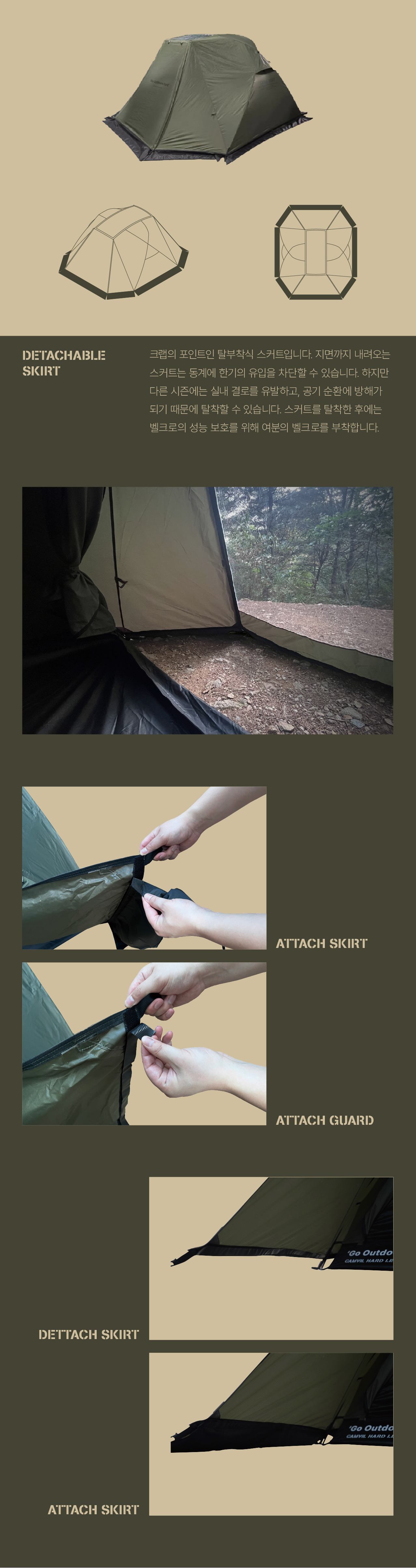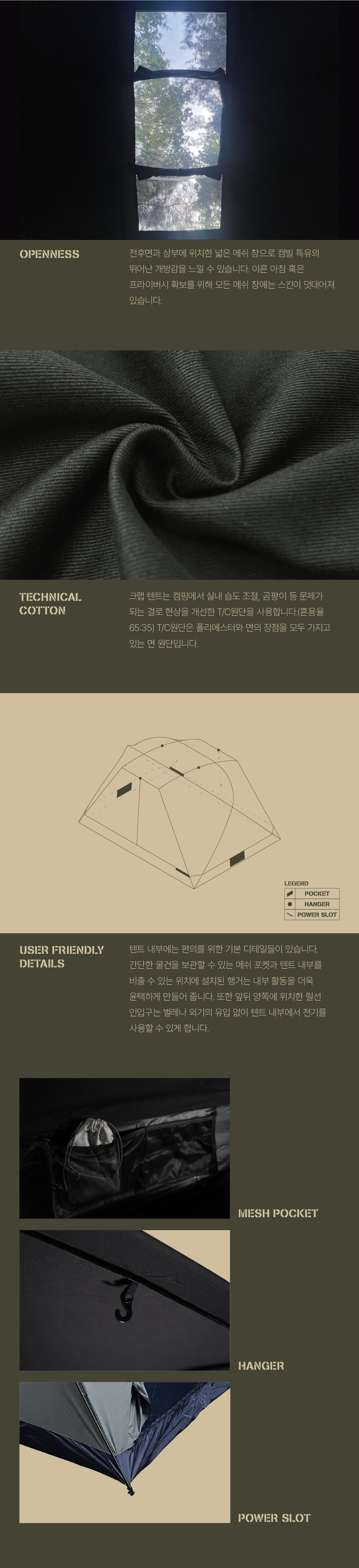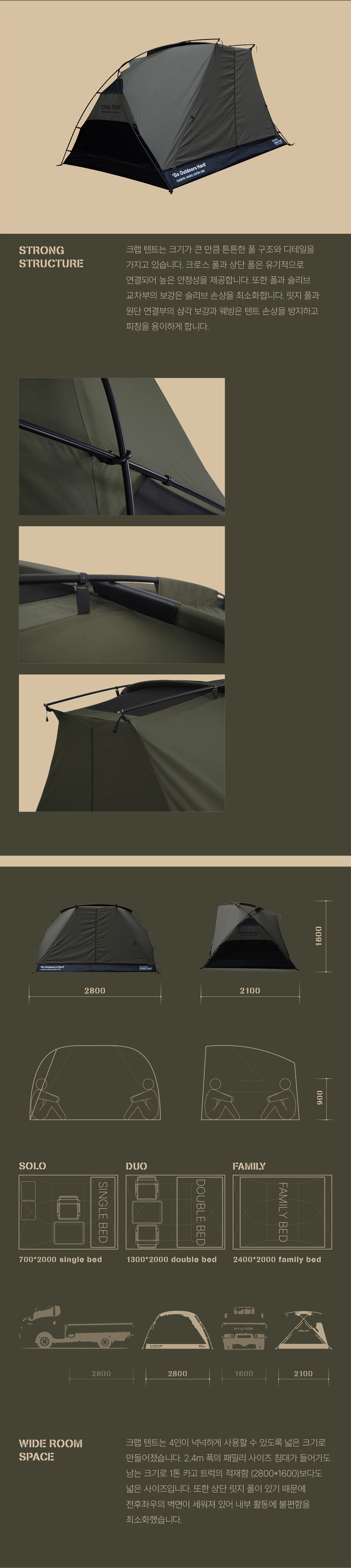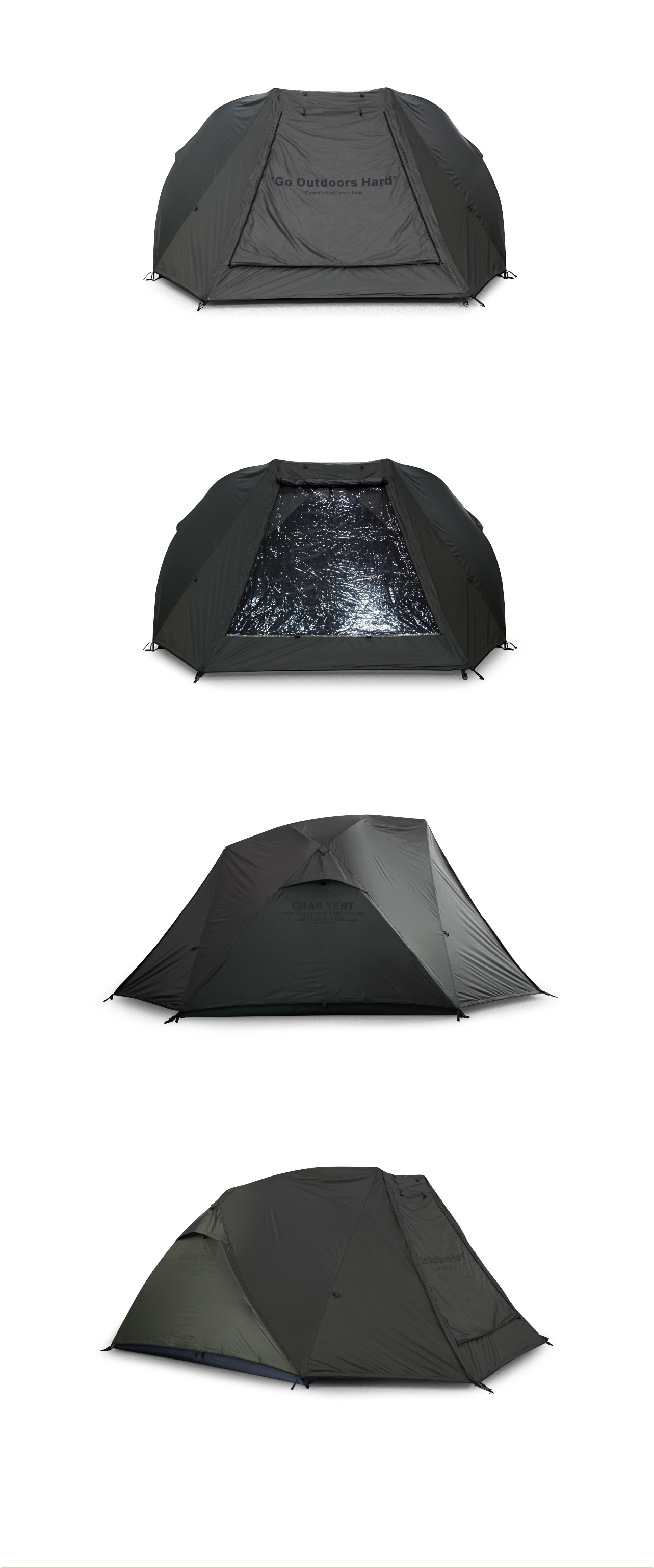 크랩 텐트는 고동 텐트의 후속작으로, 더블 크로스 폴을 기반으로 하는 4인용 면 돔텐트입니다. 고동보다 큰 게의 등갑을 모티브로 단단하고 강인한 인상으로 디자인되었습니다. 크랩의 포인트인 탈부착형 스커트는 모든 계절에 최선의 성능을 낼 수 있습니다. 또한 텐트와 플라이에는 캠빌의 시그니처인 천창이 각각 메쉬와 우레탄으로 만들어져 있습니다.