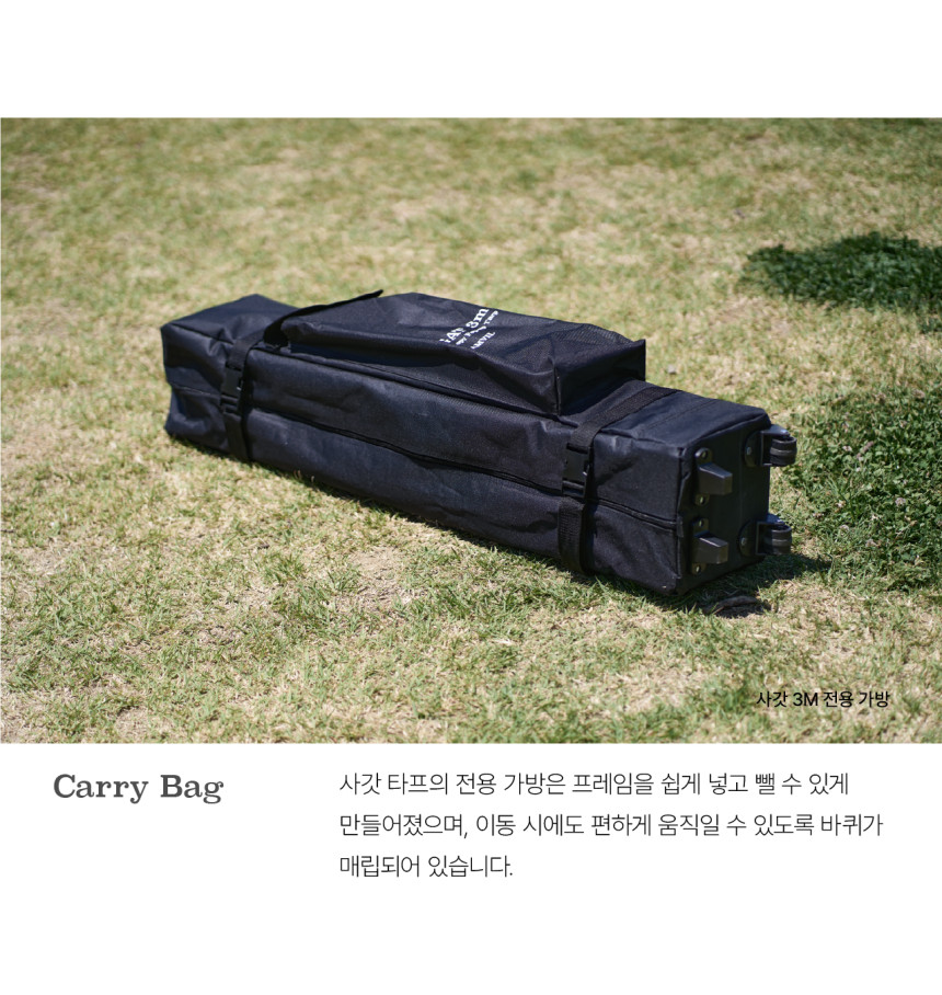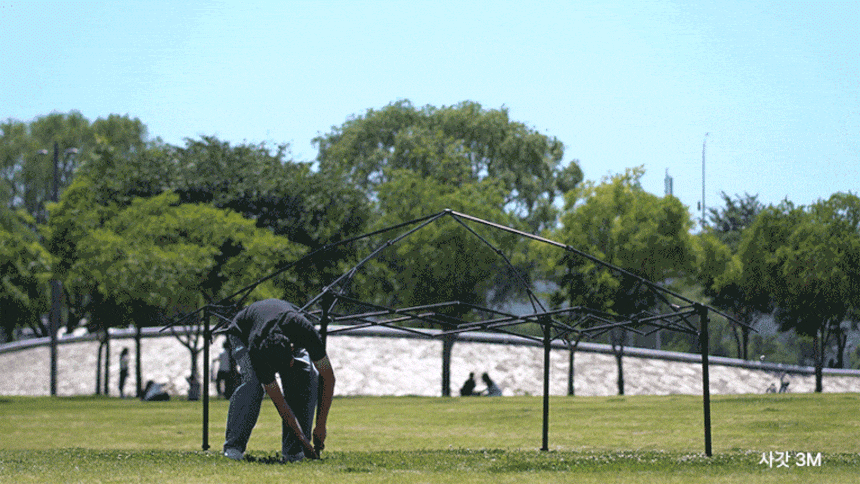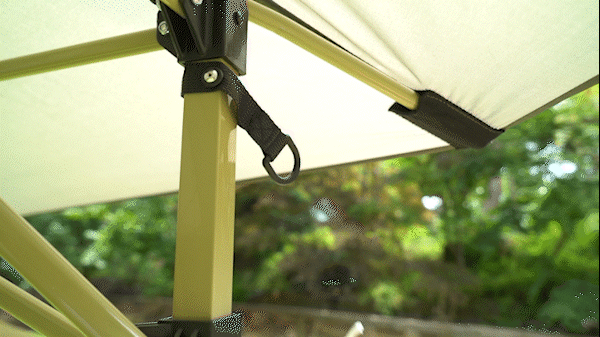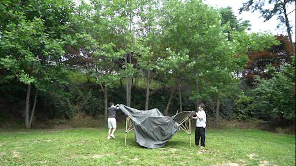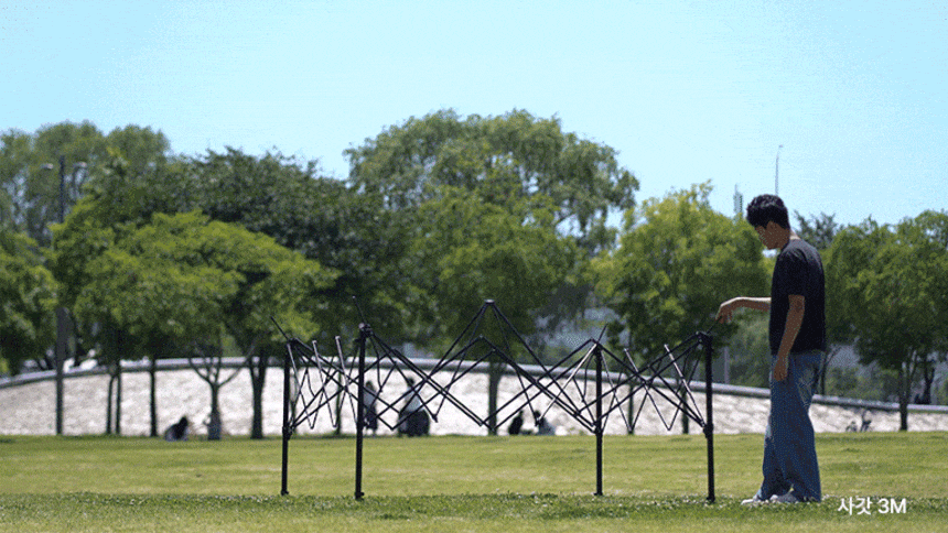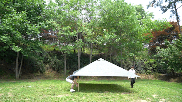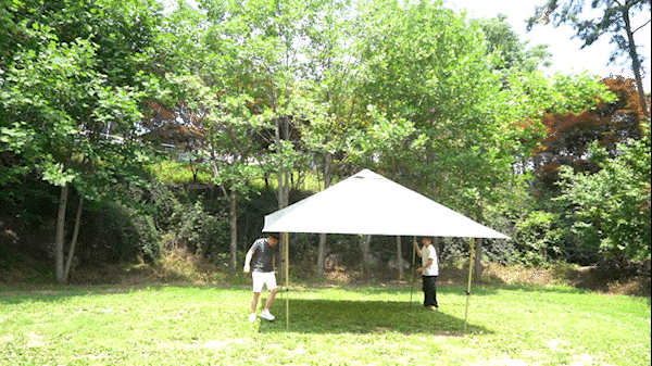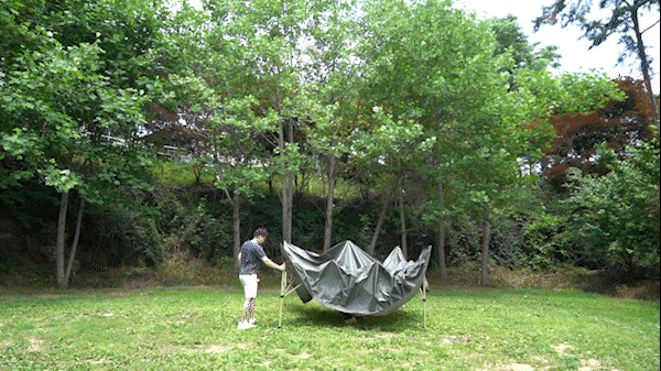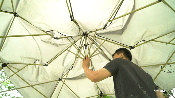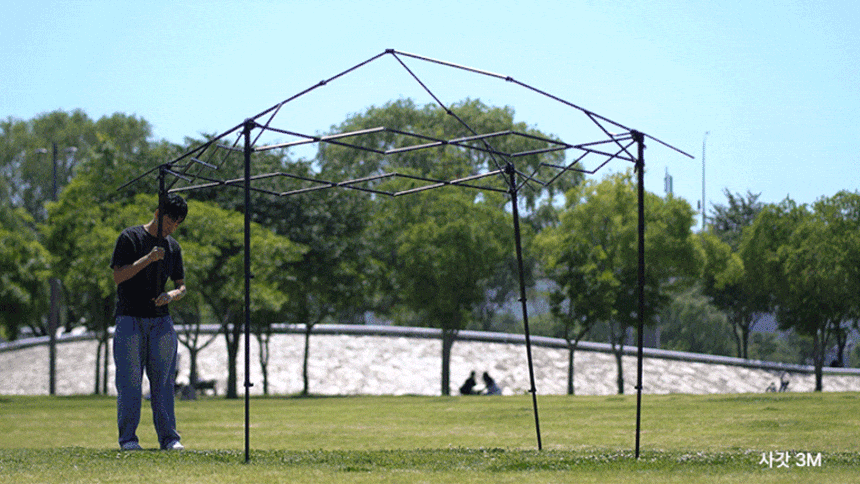 2. 타프 스킨의 모서리 네곳에 프레임을 꽂아주세요.