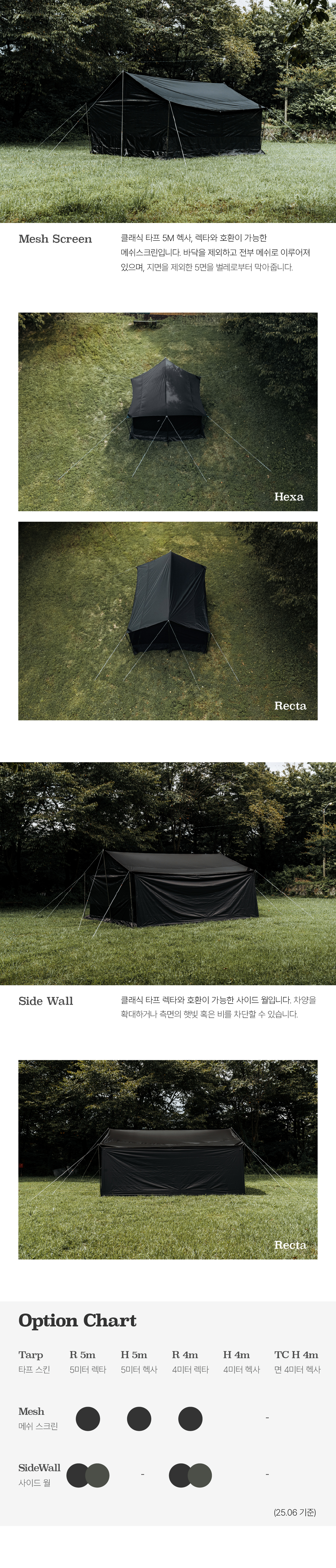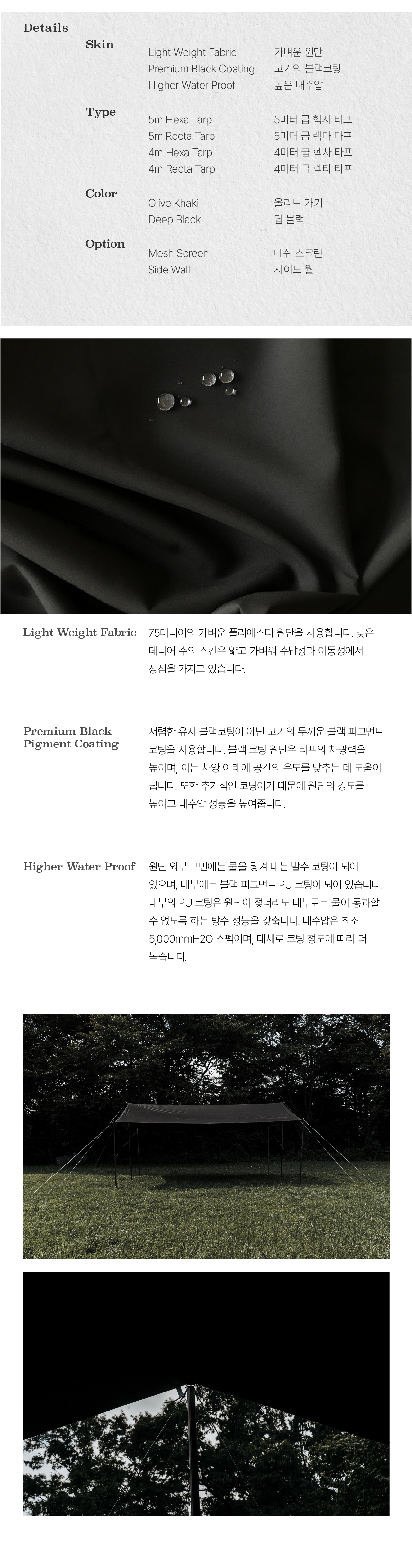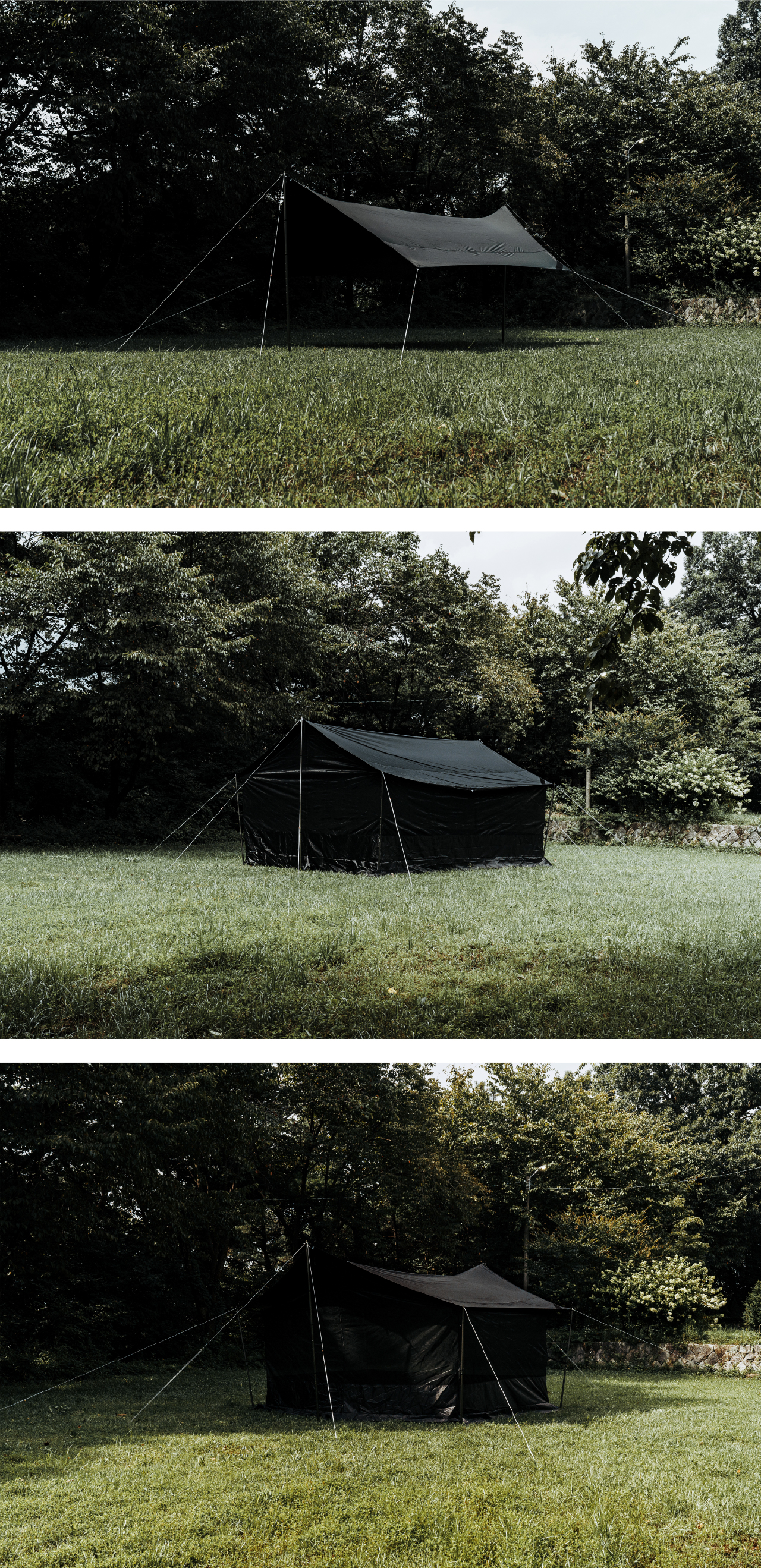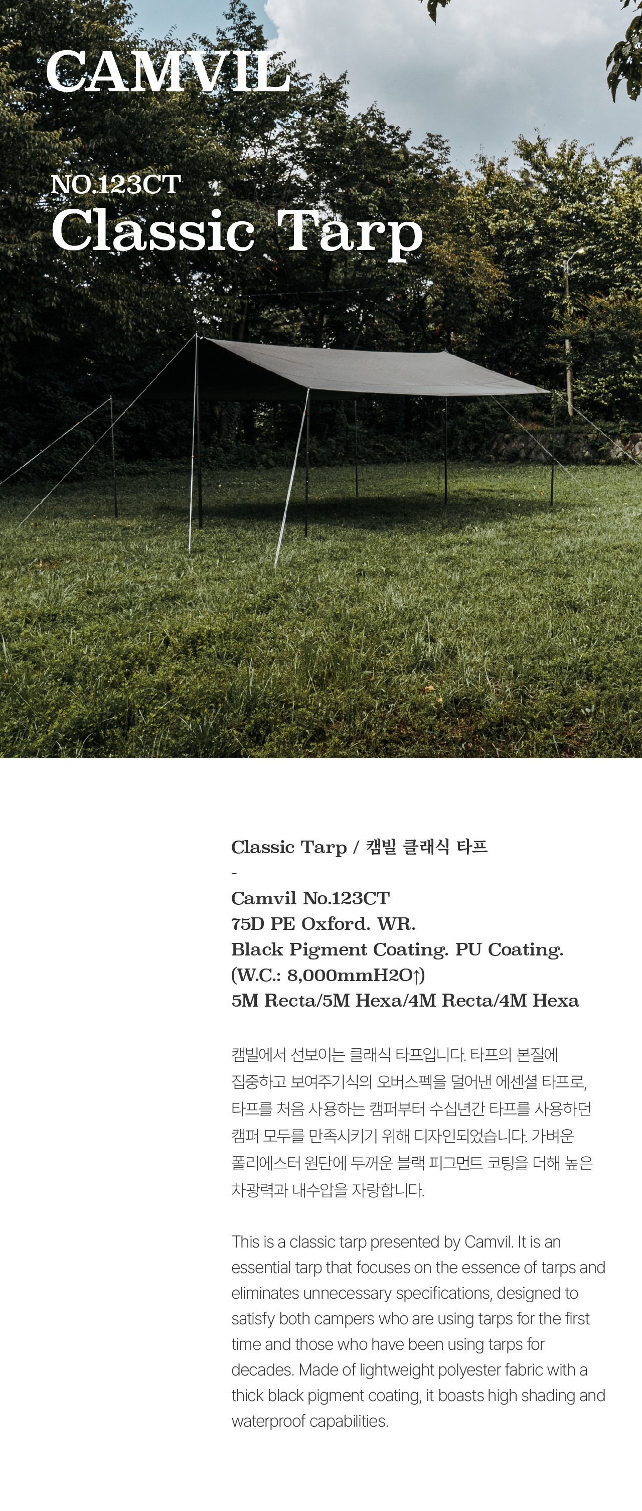 캠빌에서 선보이는 클래식 타프입니다. 타프의 본질에 집중하고 보여주기식의 오버스펙을 덜어낸 에센셜 타프로, 타프를 처음 사용하는 캠퍼부터 수십년간 타프를 사용하던 캠퍼 모두를 만족시키기 위해 디자인되었습니다. 가벼운 폴리에스터 원단에 두꺼운 블랙 피그먼트 코팅을 더해 높은 차광력과 내수압을 자랑합니다.