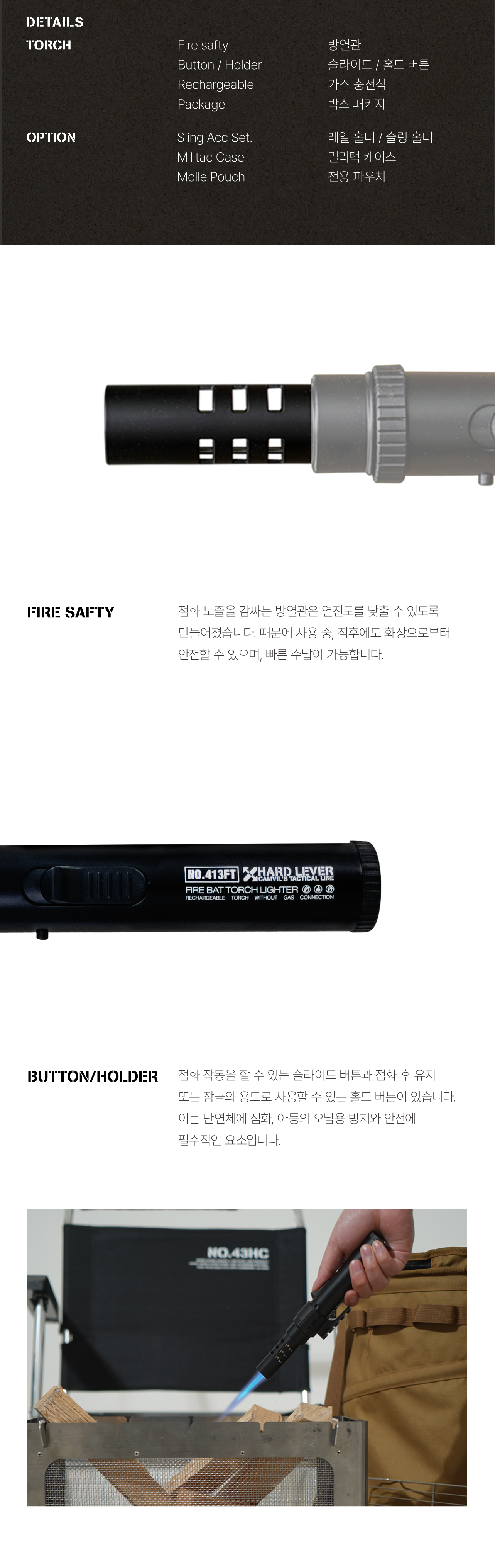 파이어 뱃 토치 라이터는 기존의 부탄가스 연결식 토치의 불편함을 개선한 충전식 토치이자 라이터입니다. 부탄가스 연결식과 달리 가스통 연결이 필요하지 않고, 내장된 가스 저장 공간에 충전하여 사용하기 때문에 부피와 무게를 줄여 이동 시 기동성이 뛰어납니다. 또한 추가 옵션으로 사용할 수 있는 피카티니 레일 마운트와 밀리택 케이스는 더욱 기능적이고 택티컬한 사용과 연출을 가능하게 합니다.