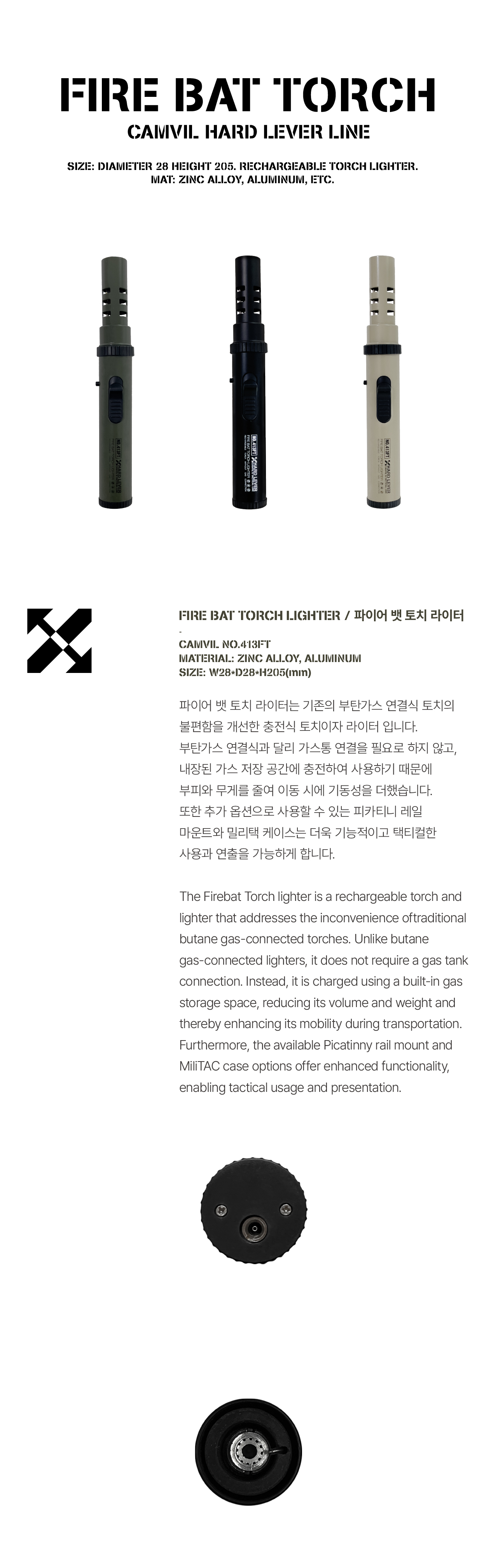 파이어 뱃 토치 라이터는 기존의 부탄가스 연결식 토치의 불편함을 개선한 충전식 토치이자 라이터입니다. 부탄가스 연결식과 달리 가스통 연결이 필요하지 않고, 내장된 가스 저장 공간에 충전하여 사용하기 때문에 부피와 무게를 줄여 이동 시 기동성이 뛰어납니다. 또한, 추가 옵션으로 사용할 수 있는 피카티니 레일 마운트와 밀리택 케이스는 더욱 기능적이고 택티컬한 사용과 연출을 가능하게 합니다.
