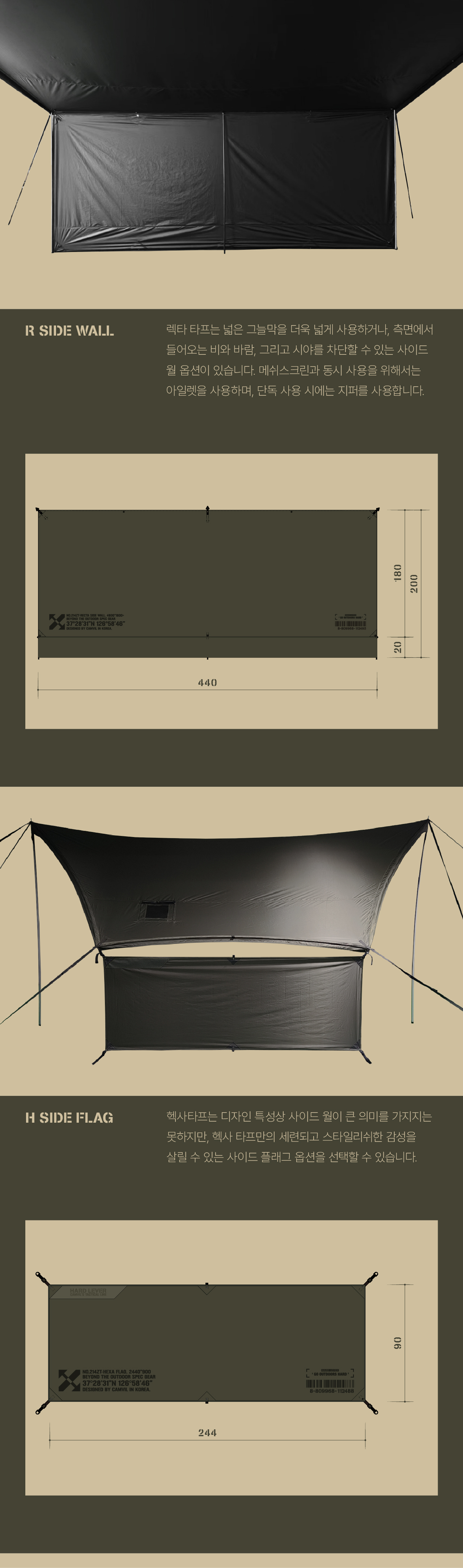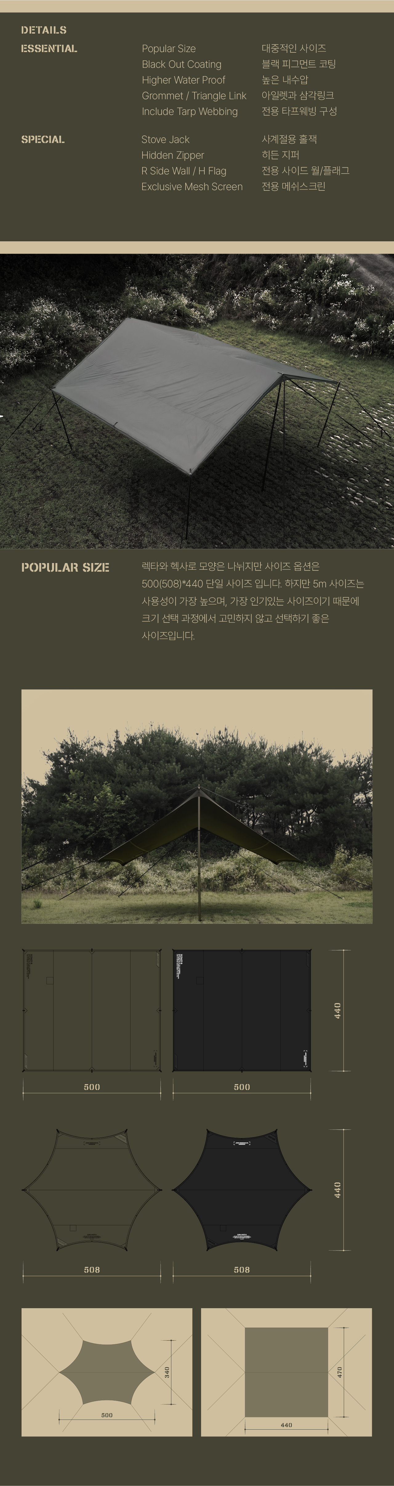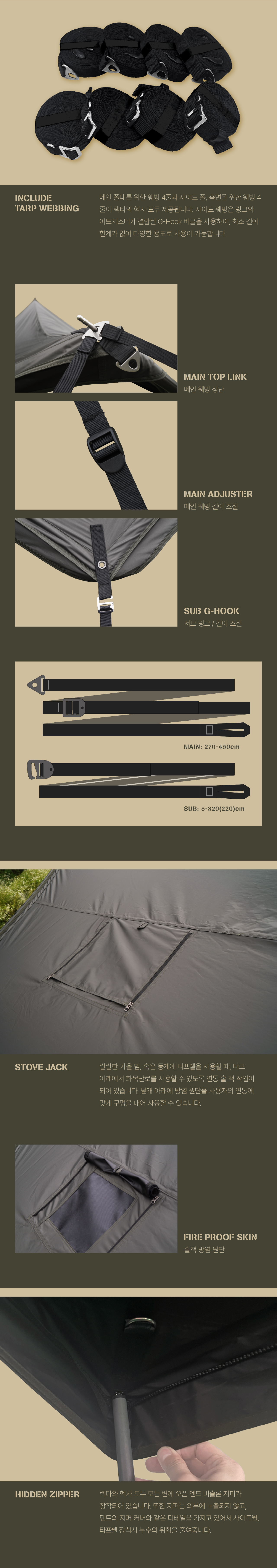 하드레버 지퍼타프는 보통의 타프와 같이 여름철 차양을 제공하는 것 뿐만이 아니라 더욱 다양한 환경에서 쾌적한 활동공간을 확보하기 위해 고안되었습니다. 프리미엄 블랙코팅으로 암막효과와 시원한 활동공간을 누릴 수 있으며, 타프 외곽에 위치한 지퍼를 통해 여름에는 메쉬스크린과 사이드월을, 겨울에는 타프쉘을 사용할 수 있습니다.