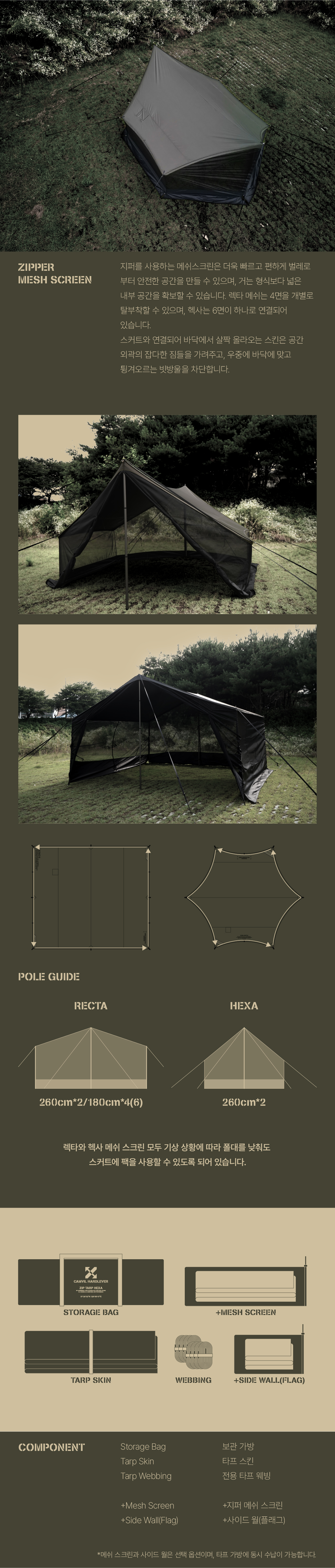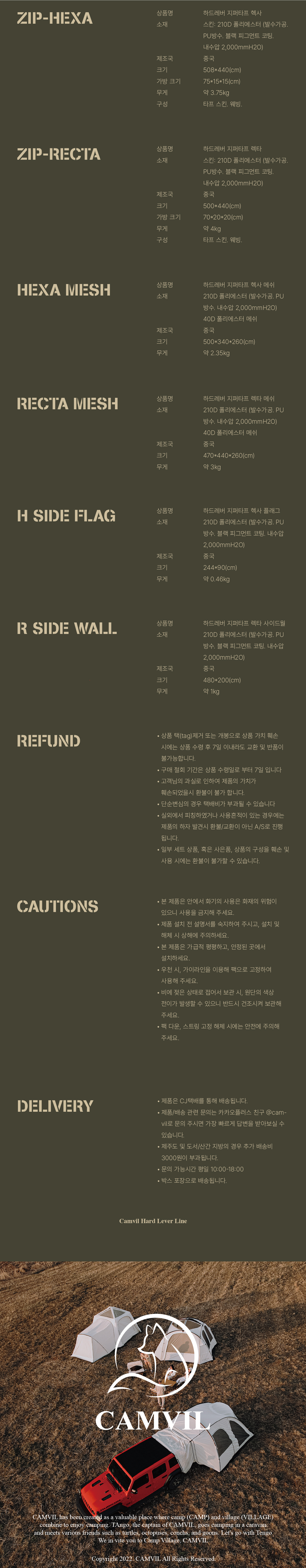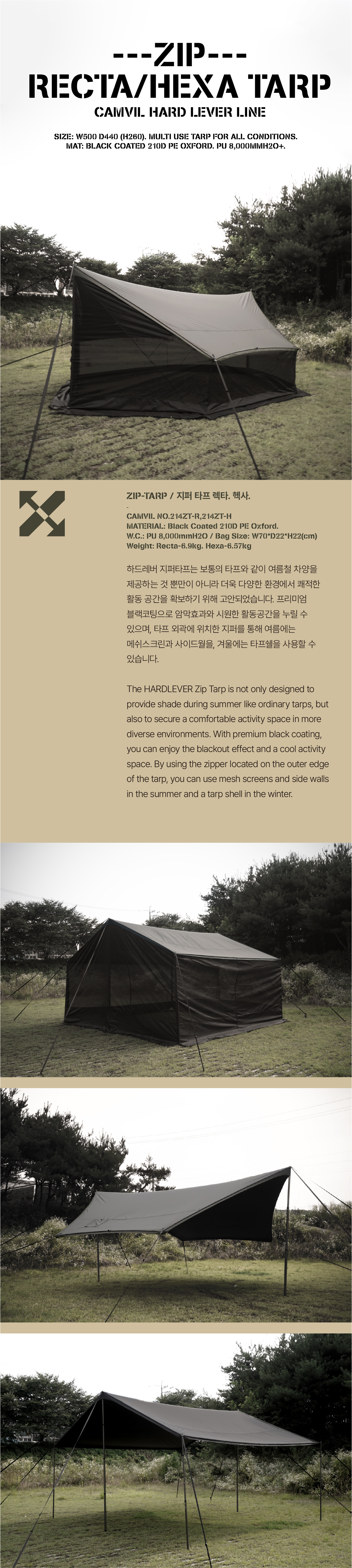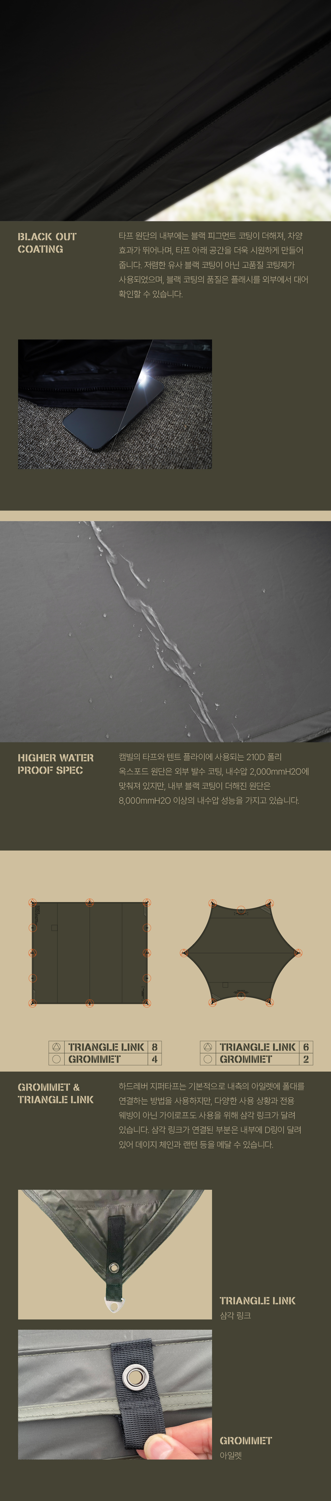 하드레버 지퍼타프는 보통의 타프와 같이 여름철 차양을 제공하는 것 뿐만이 아니라 더욱 다양한 환경에서 쾌적한 활동공간을 확보하기 위해 고안되었습니다. 프리미엄 블랙코팅으로 암막효과와 시원한 활동공간을 누릴 수 있으며, 타프 외곽에 위치한 지퍼를 통해 여름에는 메쉬스크린과 사이드월을, 겨울에는 타프쉘을 사용할 수 있습니다.
