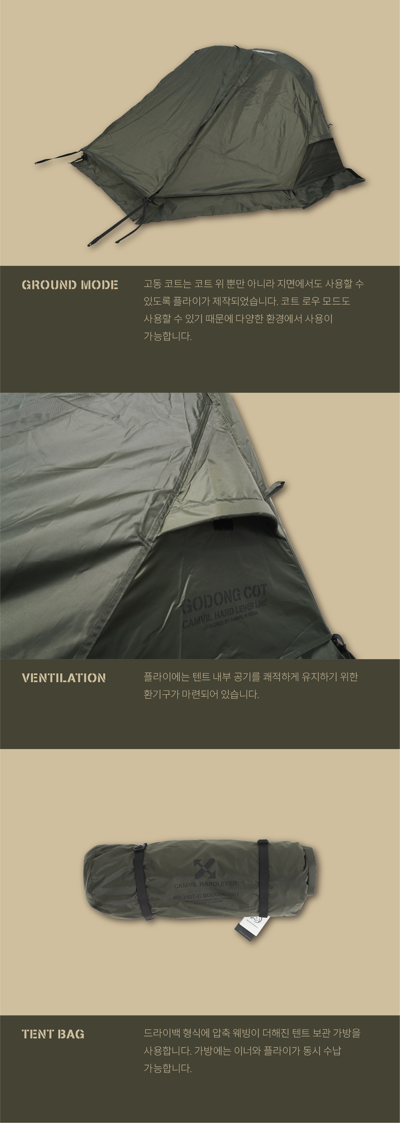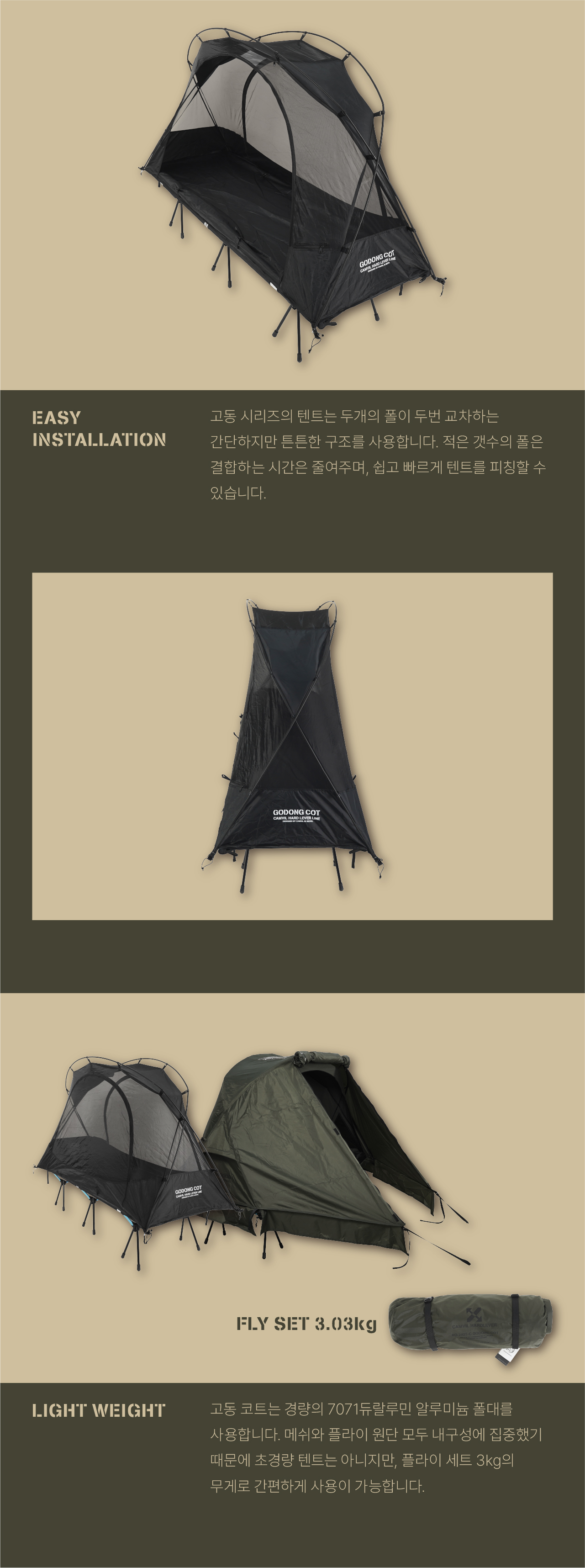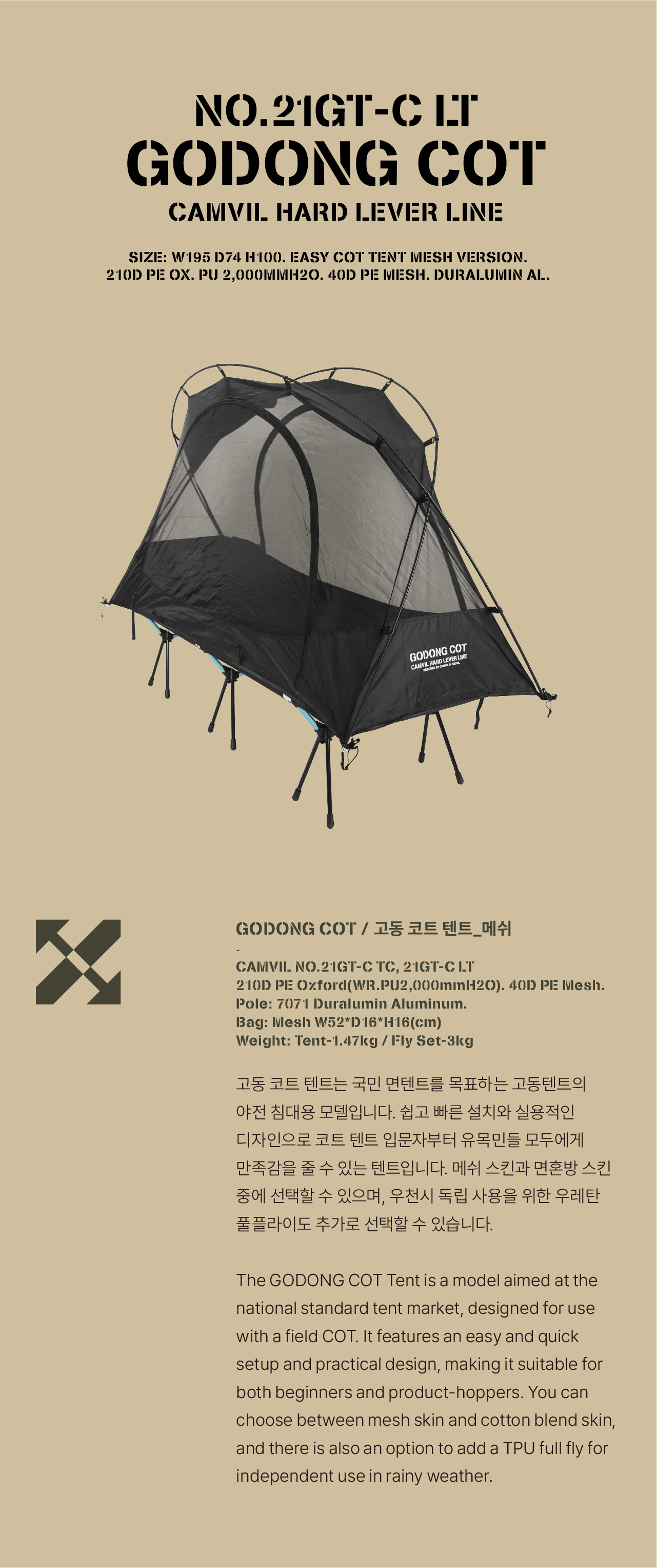 고동 코트 텐트는 국민 면텐트를 목표하는 고동텐트의 야전침대용 모델입니다. 쉽고 빠른 설치와 실용적인 디자인으로 코트 텐트 입문자부터 유목민들 모두에게 만족감을 줄 수 있는 텐트입니다. 메쉬 스킨과 면혼방 스킨 중에 선택할 수 있으며, 우천시 독립 사용을 위한 우레탄 풀플라이도 추가로 선택할 수 있습니다.