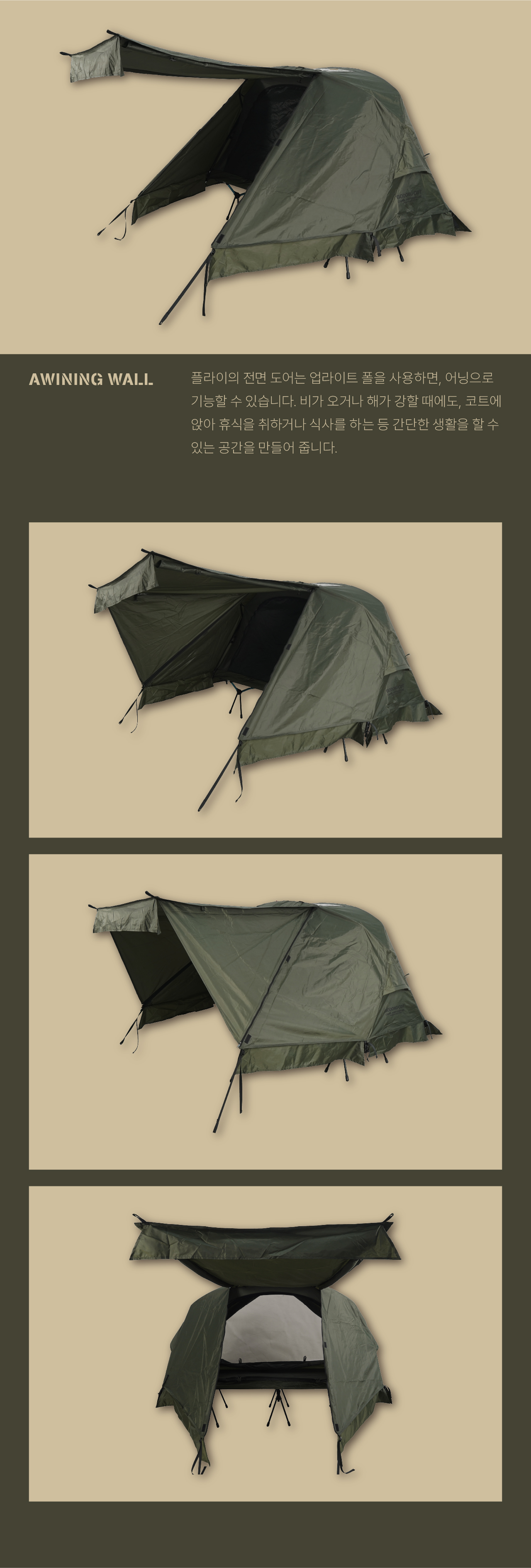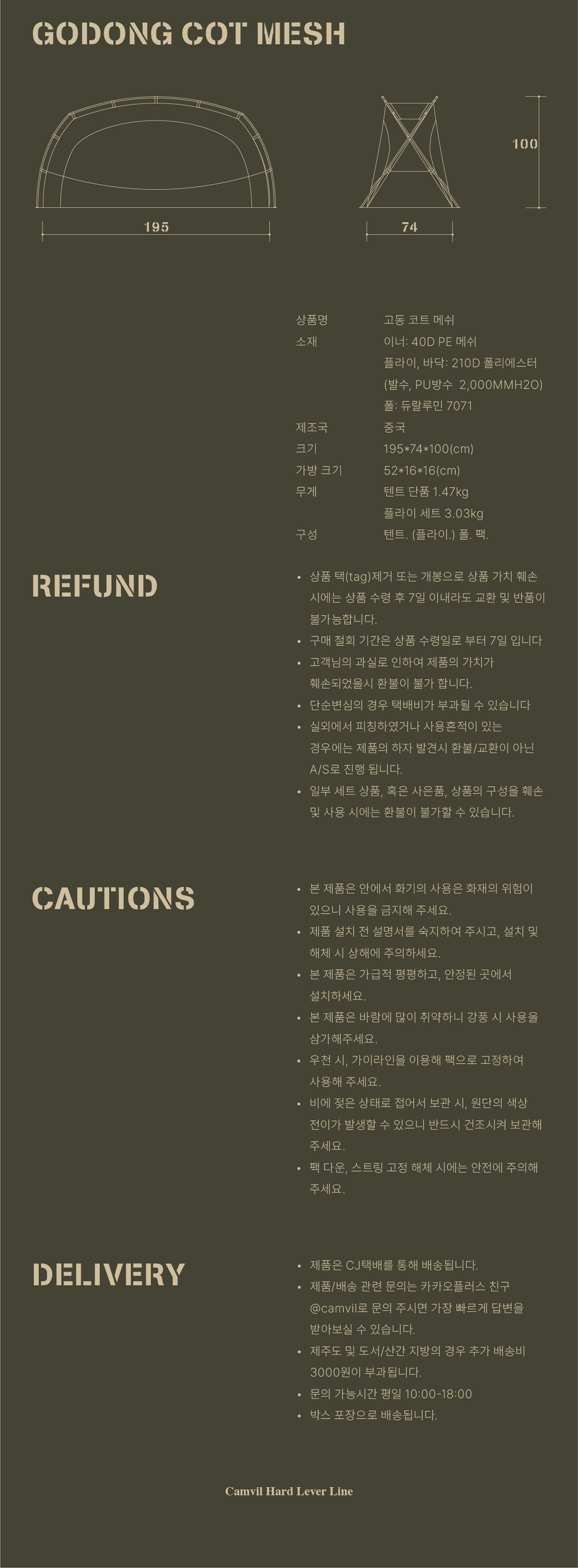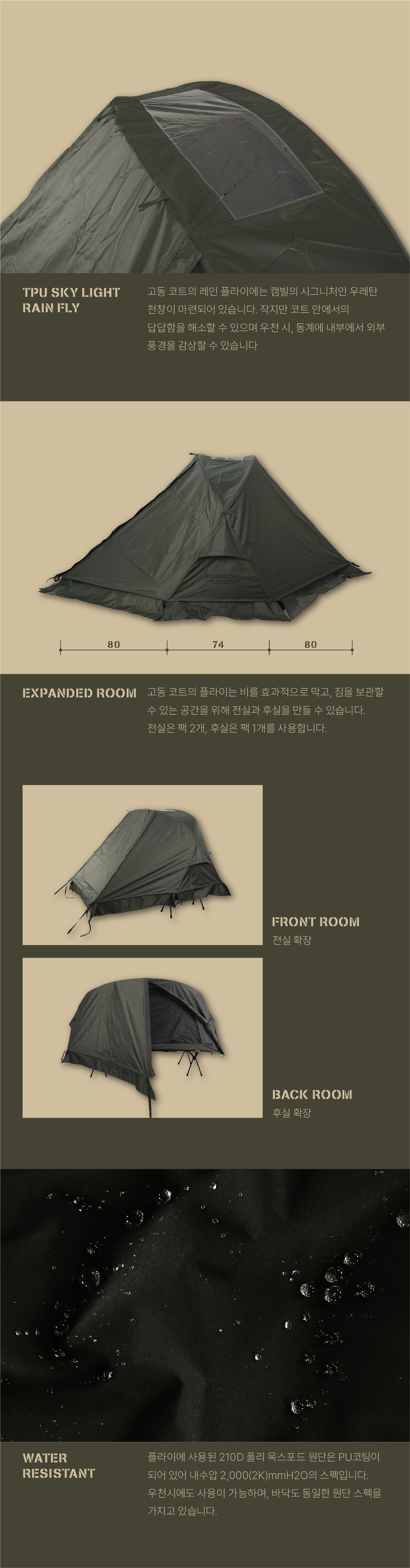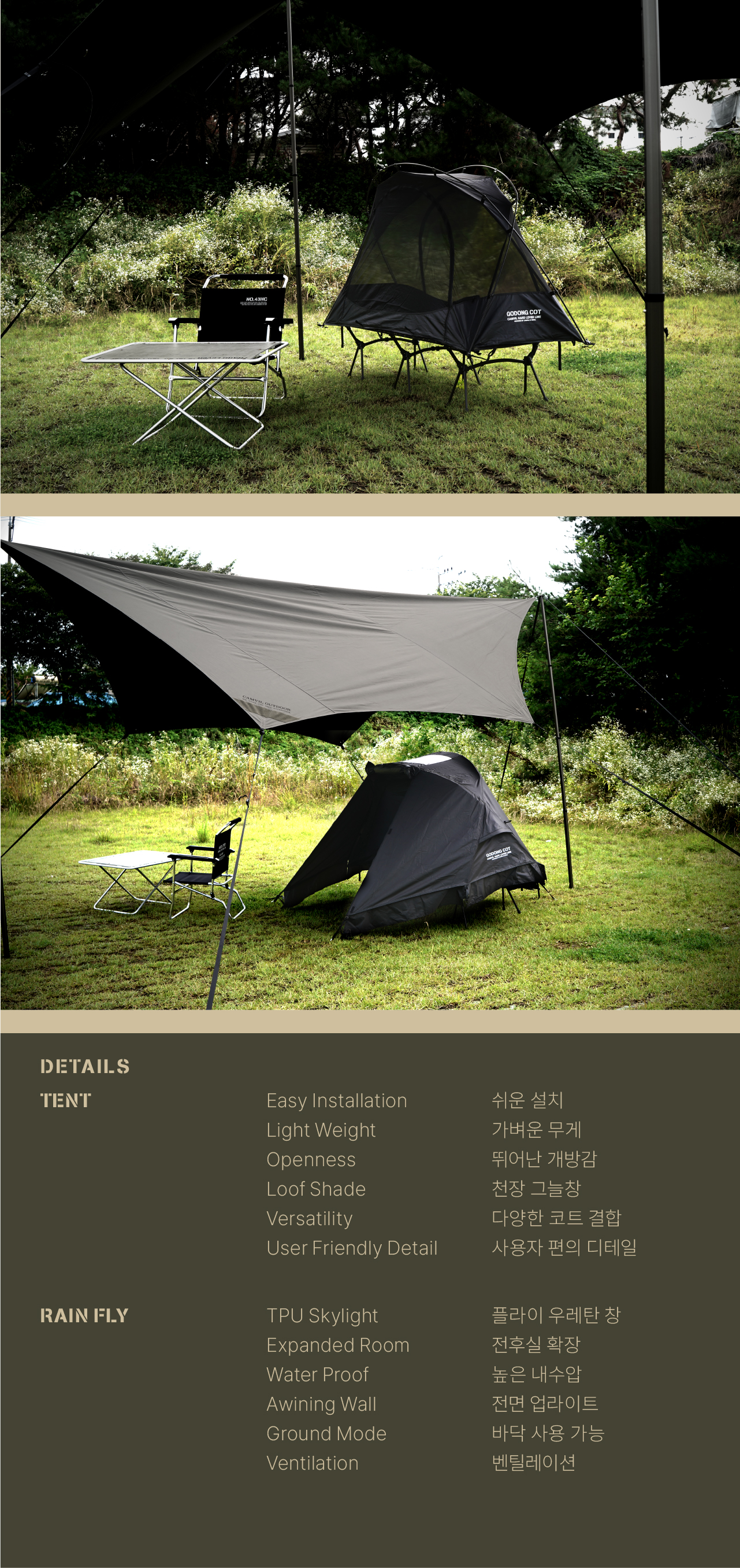 고동 코트 텐트는 국민 면텐트를 목표하는 고동텐트의 야전침대용 모델입니다. 쉽고 빠른 설치와 실용적인 디자인으로 코트 텐트 입문자부터 유목민들 모두에게 만족감을 줄 수 있는 텐트입니다. 메쉬 스킨과 면혼방 스킨 중에 선택할 수 있으며, 우천시 독립 사용을 위한 우레탄 풀플라이도 추가로 선택할 수 있습니다.