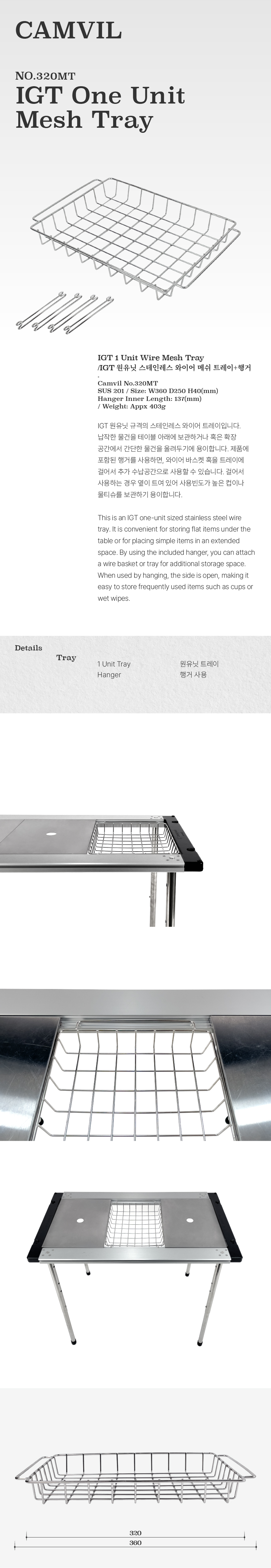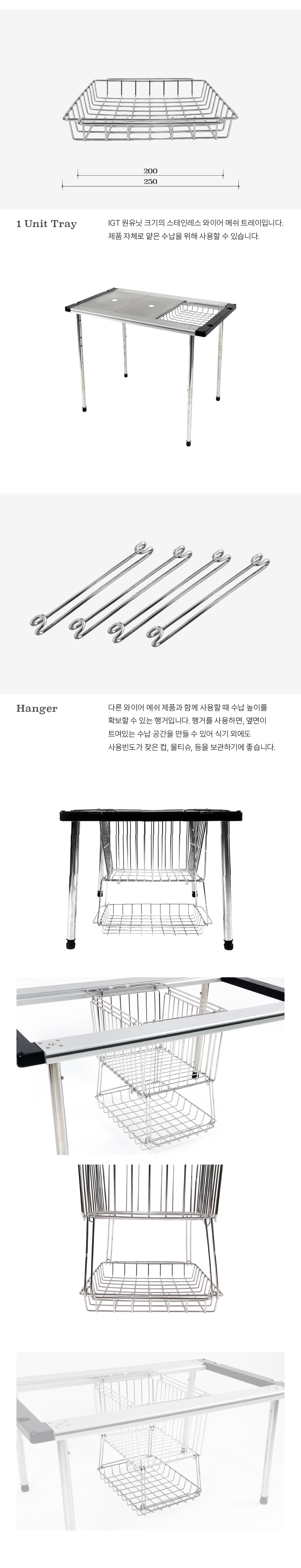 IGT 원유닛 규격의 스테인레스 와이어 트레이입니다. 납작한 물건을 테이블 아래에 보관하거나 혹은 확장 공간에서 간단한 물건을 올려두기에 용이합니다. 제품에 포함된 행거를 사용하면, 와이어 바스켓 혹을 트레이에 걸어서 추가 수납공간으로 사용할 수 있습니다. 걸어서 사용하는 경우 옆이 트여 있어 사용빈도가 높은 컵이나 물티슈를 보관하기 용이합니다.