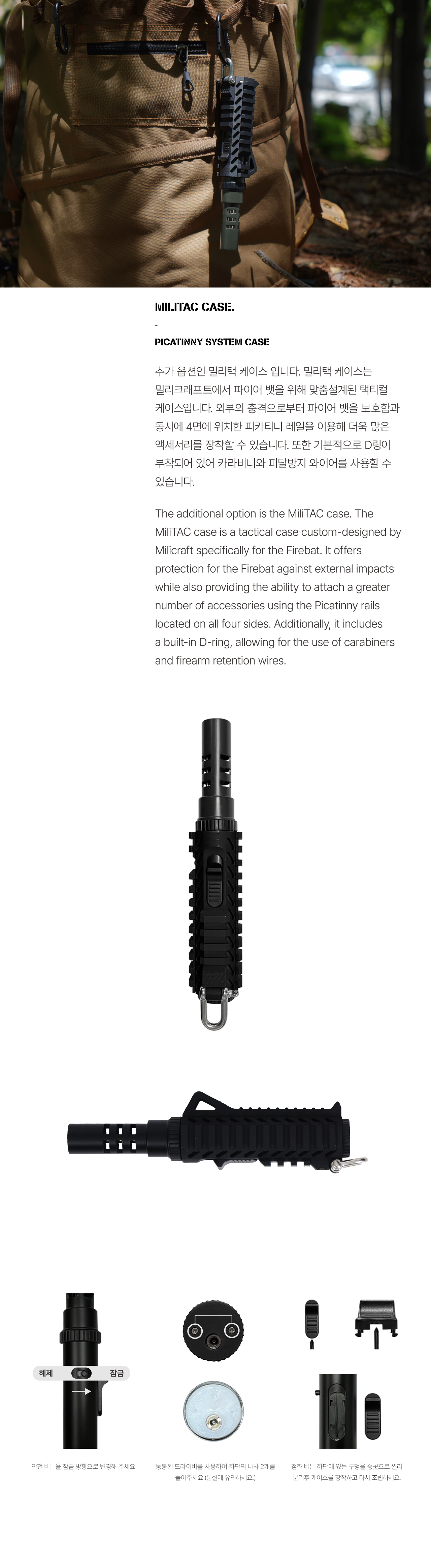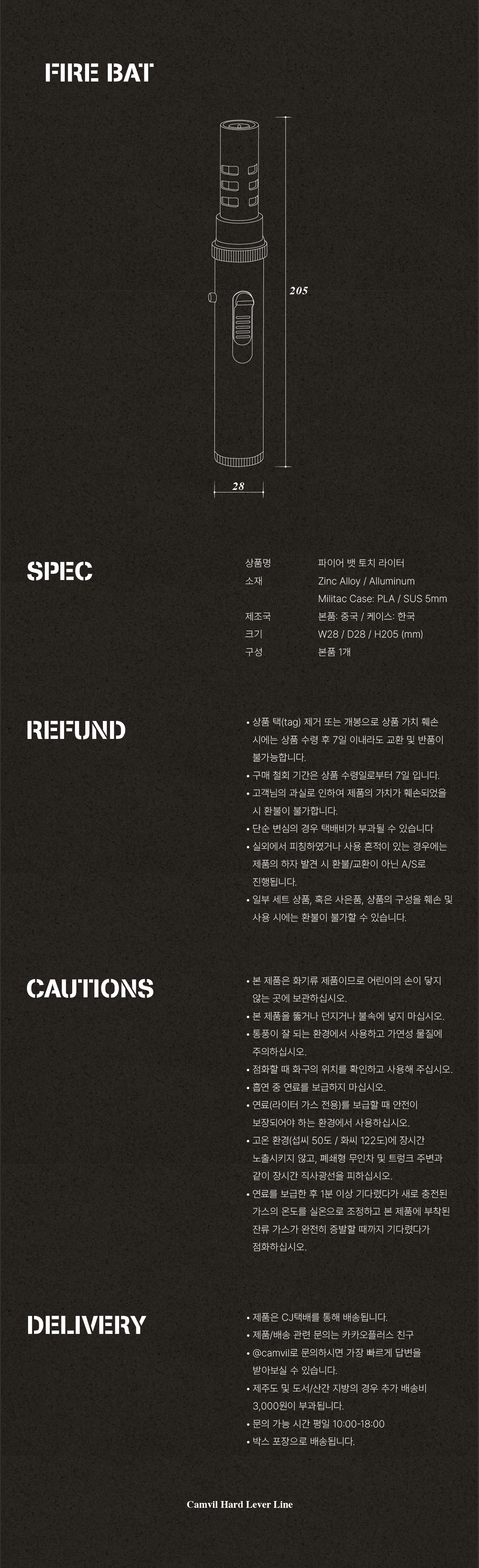 파이어 뱃 토치 라이터는 기존의 부탄가스 연결식 토치의 불편함을 개선한 충전식 토치이자 라이터입니다. 부탄가스 연결식과 달리 가스통 연결이 필요하지 않고, 내장된 가스 저장 공간에 충전하여 사용하기 때문에 부피와 무게를 줄여 이동 시 기동성이 뛰어납니다. 또한 추가 옵션으로 사용할 수 있는 피카티니 레일 마운트와 밀리택 케이스는 더욱 기능적이고 택티컬한 사용과 연출을 가능하게 합니다.