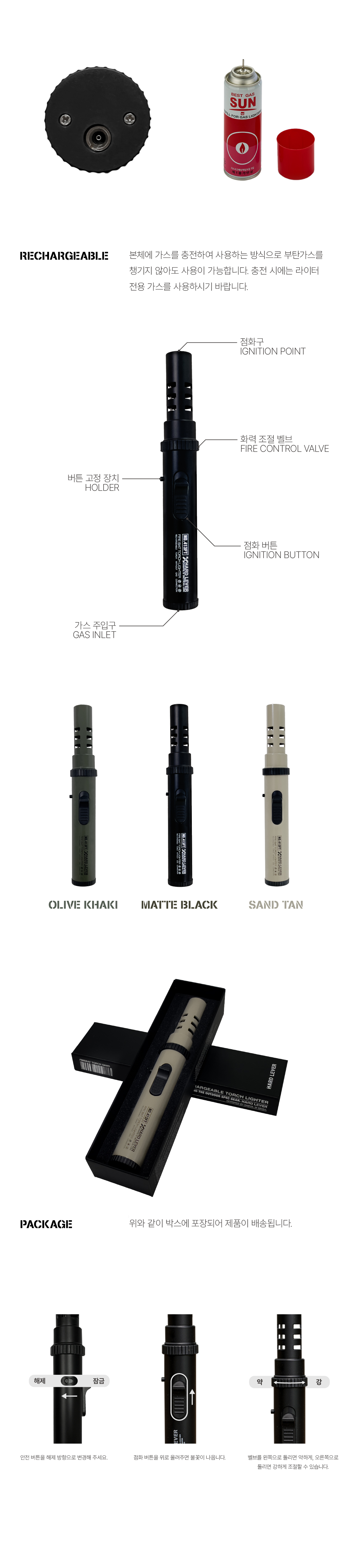 파이어 뱃 토치 라이터는 기존의 부탄가스 연결식 토치의 불편함을 개선한 충전식 토치이자 라이터입니다. 부탄가스 연결식과 달리 가스통 연결이 필요하지 않고, 내장된 가스 저장 공간에 충전하여 사용하기 때문에 부피와 무게를 줄여 이동 시 기동성이 뛰어납니다. 또한, 추가 옵션으로 사용할 수 있는 피카티니 레일 마운트와 밀리택 케이스는 더욱 기능적이고 택티컬한 사용과 연출을 가능하게 합니다.