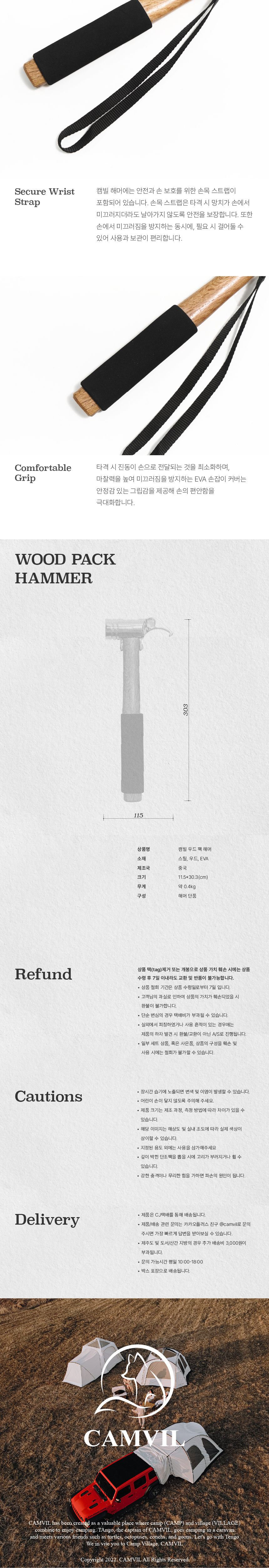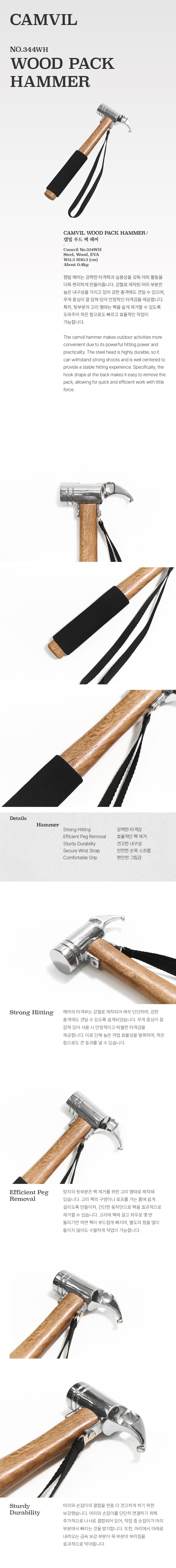 캠빌 해머는 강력한 타격력과 실용성을 갖춰 야외 활동을 더욱 편리하게 만들어줍니다. 강철로 제작된 머리 부분은 높은 내구성을 가지고 있어 강한 충격에도 견딜 수 있으며, 무게 중심이 잘 잡혀 있어 안정적인 타격감을 제공합니다. 특히, 뒷부분의 고리 형태는 팩을 쉽게 제거할 수 있도록 도와주어 적은 힘으로도 빠르고 효율적인 작업이 가능합니다.