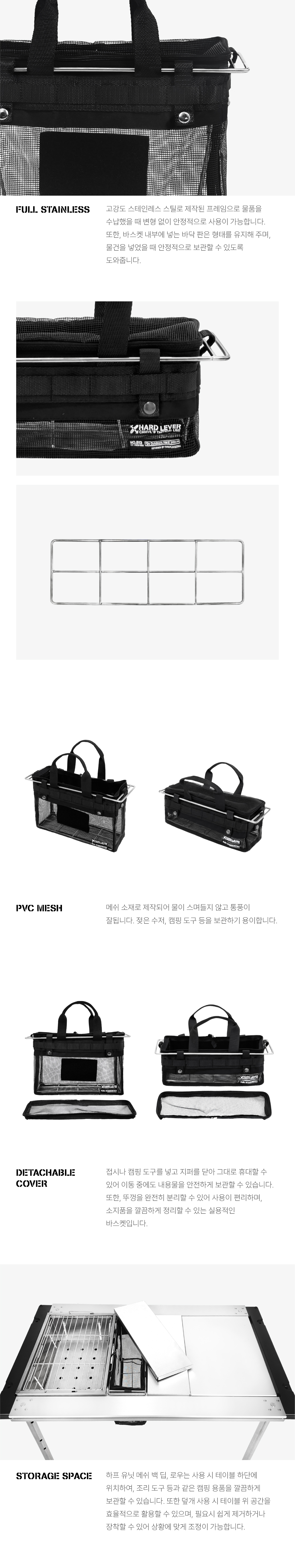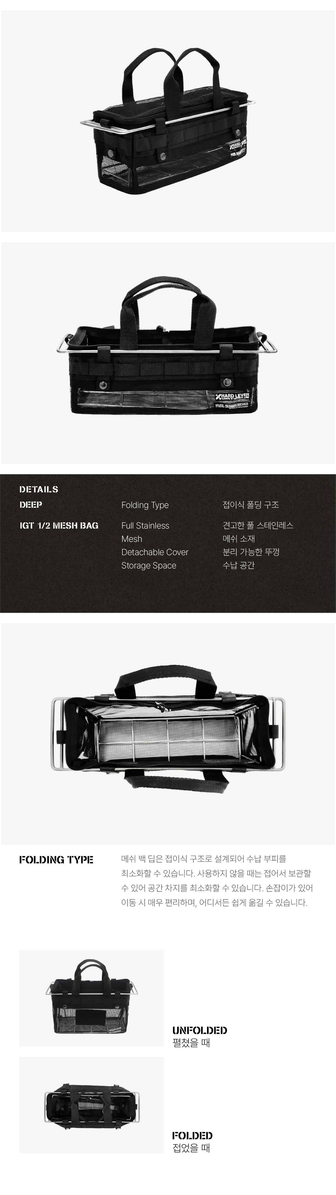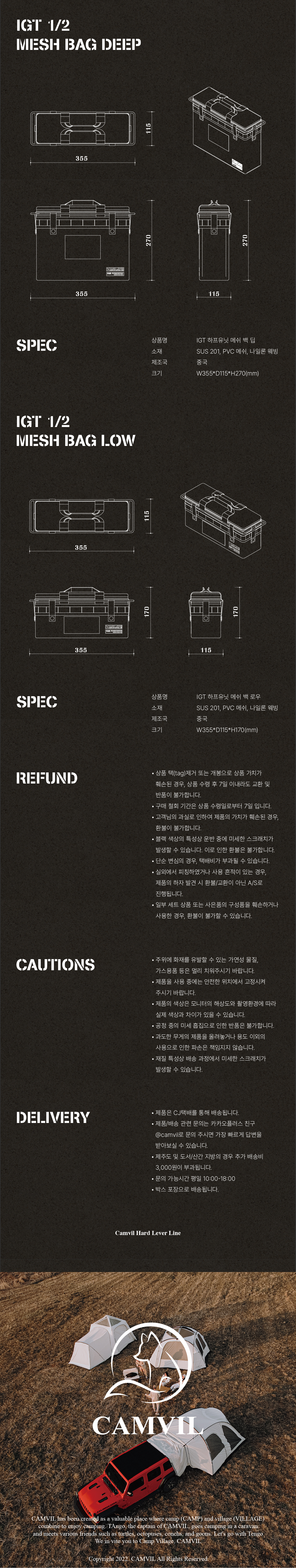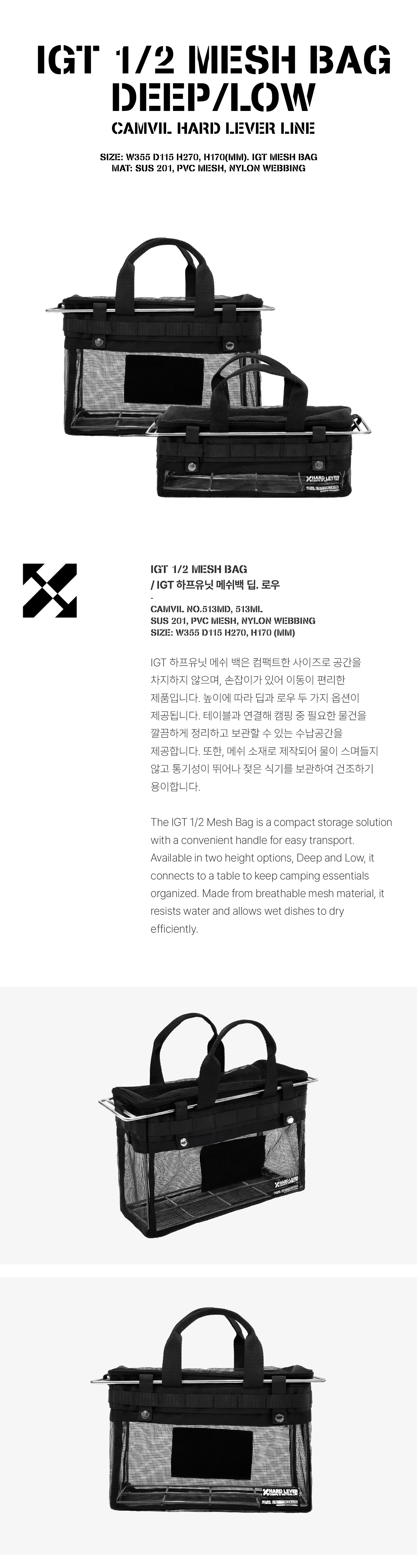 IGT 하프유닛 메쉬 백은 컴팩트한 사이즈로 공간을 차지하지 않으며, 손잡이가 있어 이동이 편리한 제품입니다. 높이에 따라 딥과 로우 두 가지 옵션이 제공됩니다. 테이블과 연결해 캠핑 중 필요한 물건을 깔끔하게 정리하고 보관할 수 있는 수납공간을 제공합니다. 또한, 메쉬 소재로 제작되어 물이 스며들지 않고 통기성이 뛰어나 젖은 식기를 보관하여 건조하기 용이합니다.