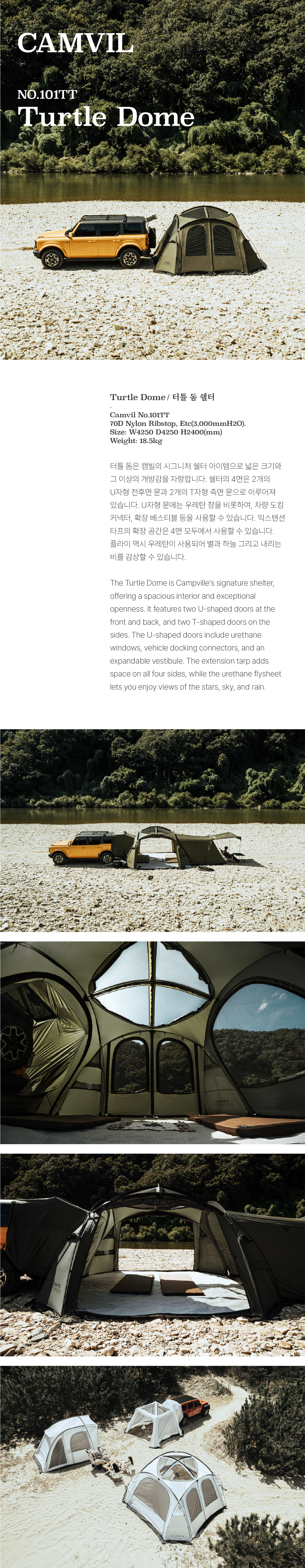 터틀 돔은 캠빌의 시그네처 쉘터 아이템으로 넓은 크기와 그 이상의 개방감을 자랑합니다. 쉘터의 4면은 2개의 U자형 전후면 문과 2개의 T자형 측면 문으로 이루어져 있습니다. U자형 문에는 우레탄 창을 비롯하여, 차량 도킹 커넥터, 확장 베스티블 등을 사용할 수 있습니다. 익스텐션 타프의 확장 공간은 4면 모두에서 사용할 수 있습니다. 플라이 역시 우레탄이 사용되어 별과 하늘, 그리고 내리는 비를 감상할 수 있습니다.