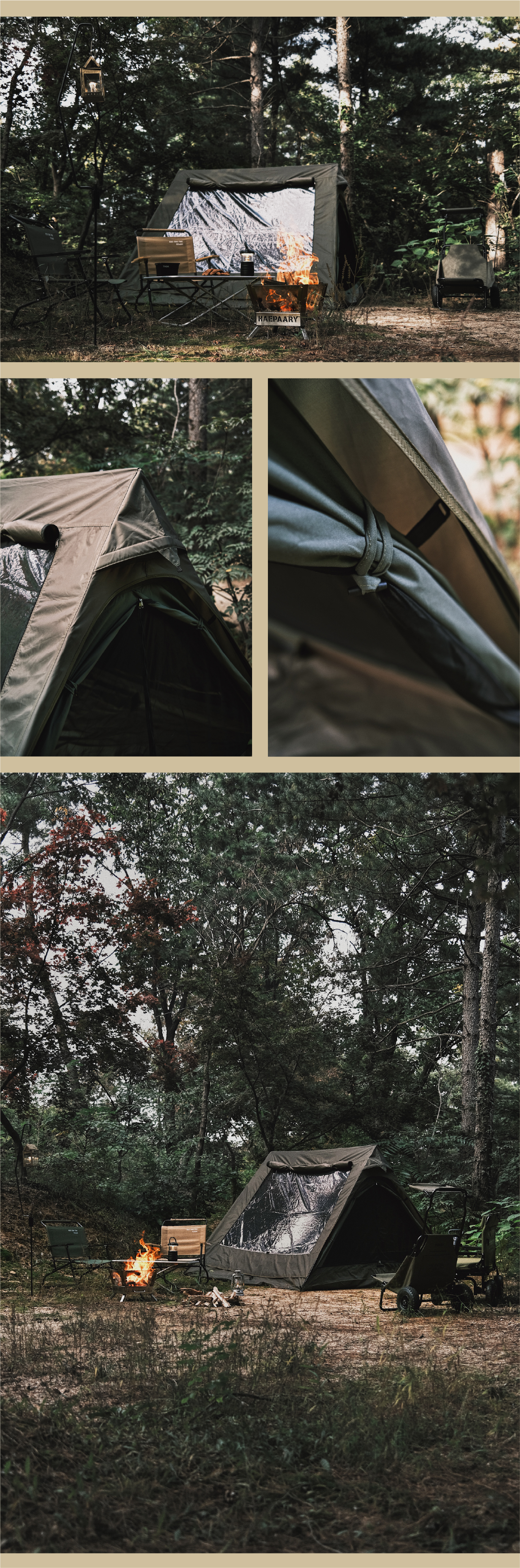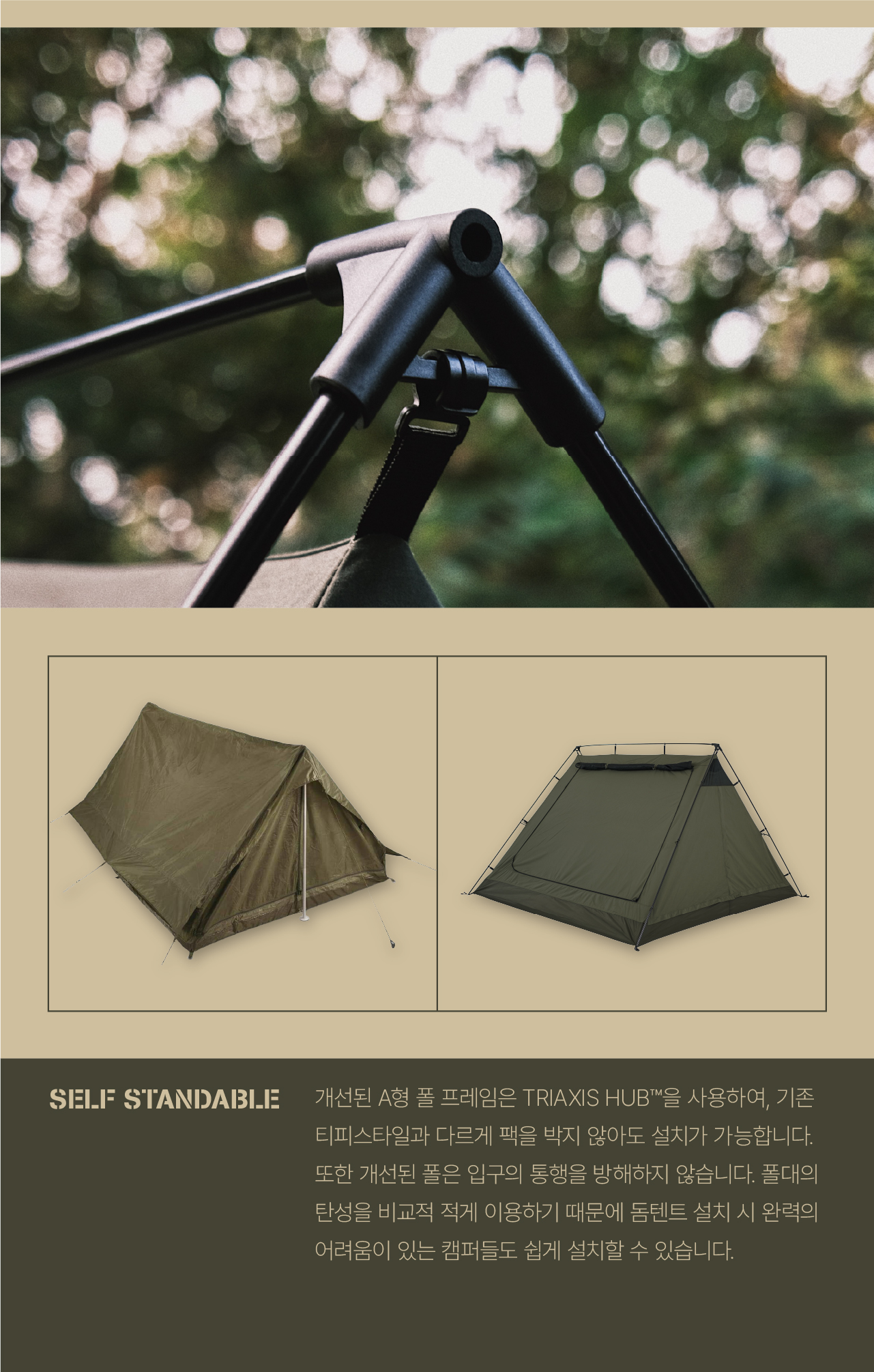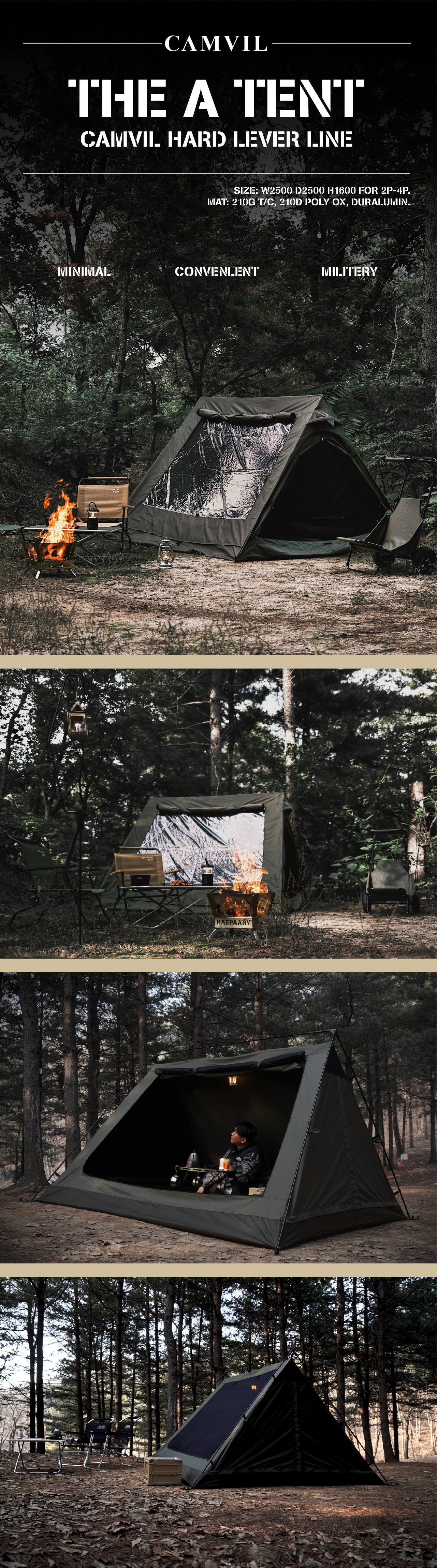 에이 텐트는 캠빌 하드레버 라인의 밀리터리 스타일 텐트입니다. 군용으로 사용되는 기존 에이형 프레임에 착안하여 단점을 보완하고 자연을 최대한 즐길 수 있도록 만들어졌습니다. 하드레버 에이텐트는 TRIAXIS HUB™를 사용하여 기존 에이형 텐트와 달리 자립이 가능하며 캠빌의 시그니처 우레탄 창을 에이 구조에 맞게 3Layer 형태로 구현했습니다. 개선된 2.0부터는 경사면의 창문이 스킨, 메쉬 2Layer로 적용되었으며 모두 개방 가능합니다.