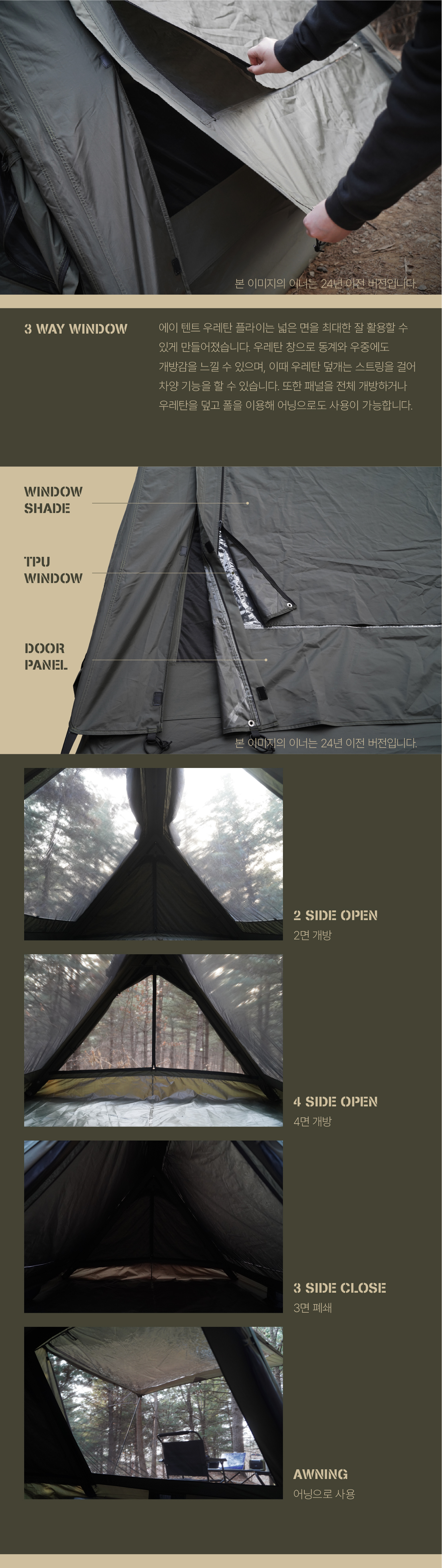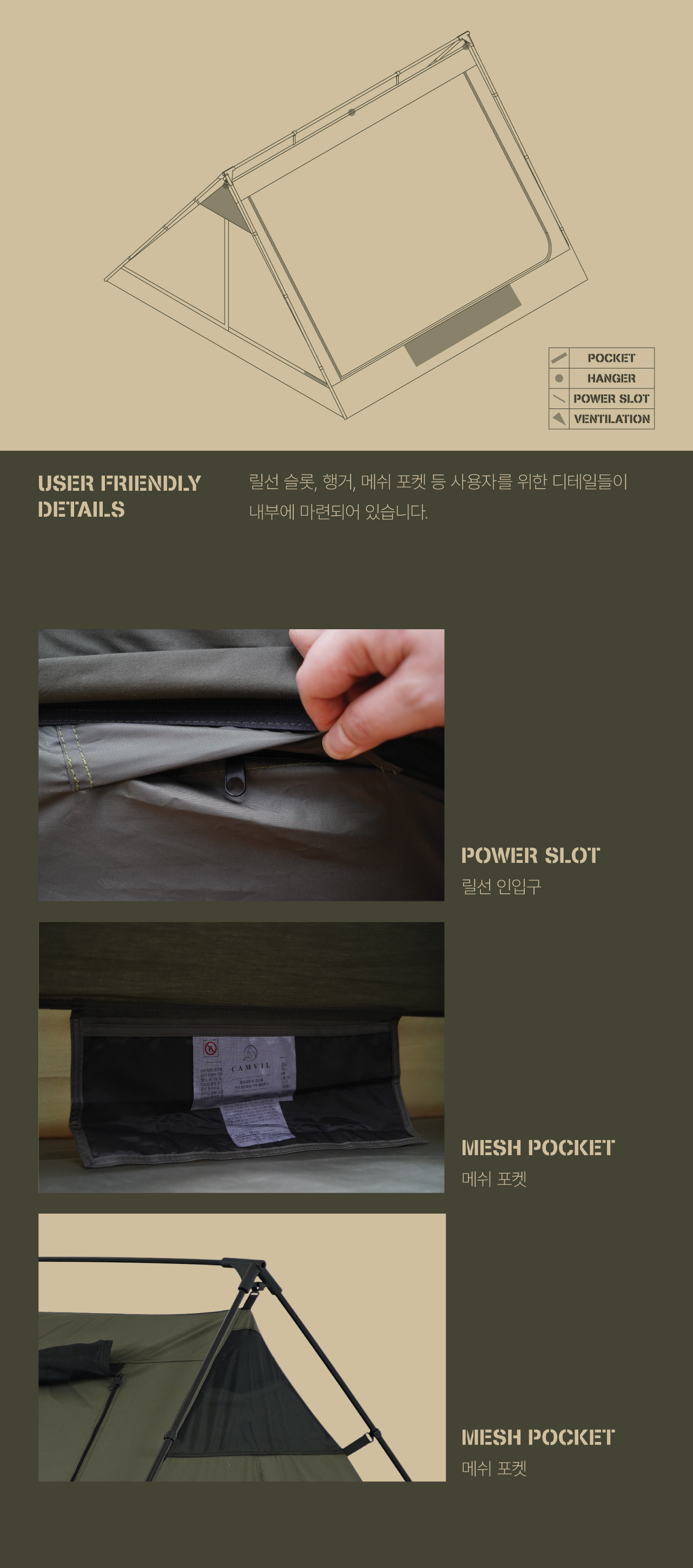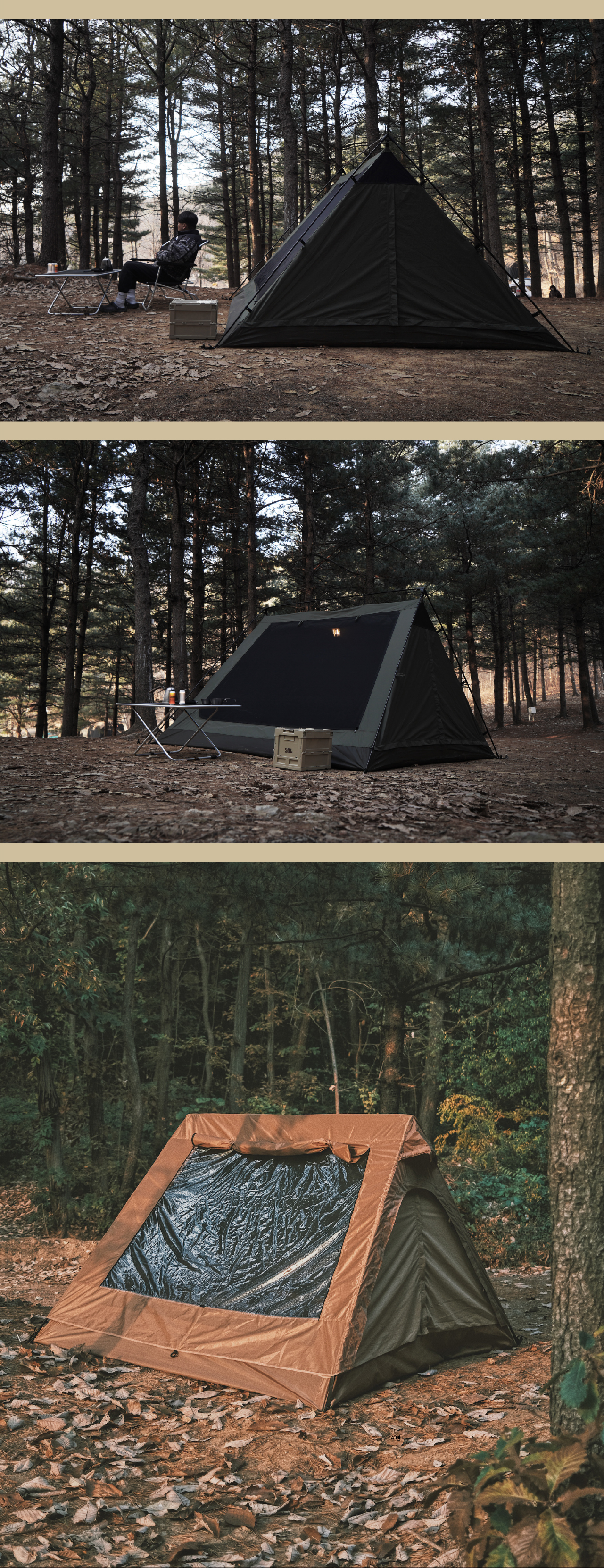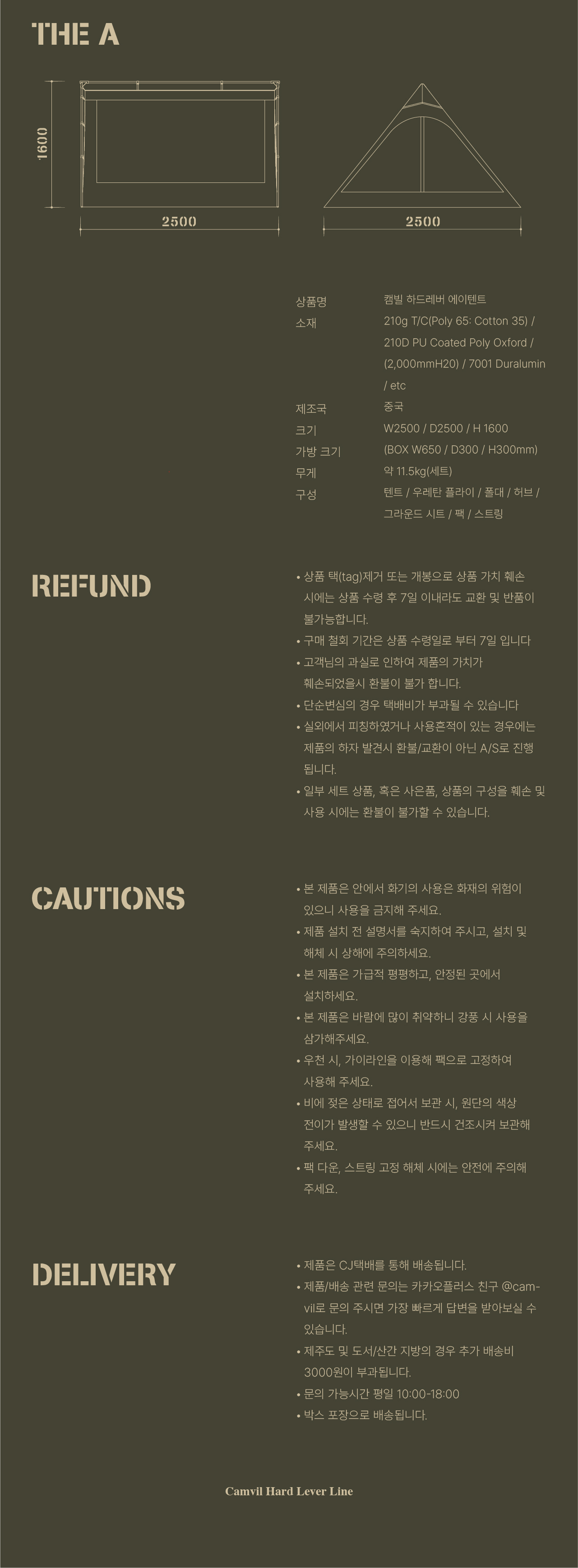 에이 텐트는 캠빌 하드레버 라인의 밀리터리 스타일 텐트입니다. 군용으로 사용되는 기존 에이형 프레임에 착안하여 단점을 보완하고 자연을 최대한 즐길 수 있도록 만들어졌습니다. 하드레버 에이텐트는 TRIAXIS HUB™를 사용하여 기존 에이형 텐트와 달리 자립이 가능하며 캠빌의 시그니처 우레탄 창을 에이 구조에 맞게 3Layer 형태로 구현했습니다. 개선된 2.0부터는 경사면의 창문이 스킨, 메쉬 2Layer로 적용되었으며 모두 개방 가능합니다.
